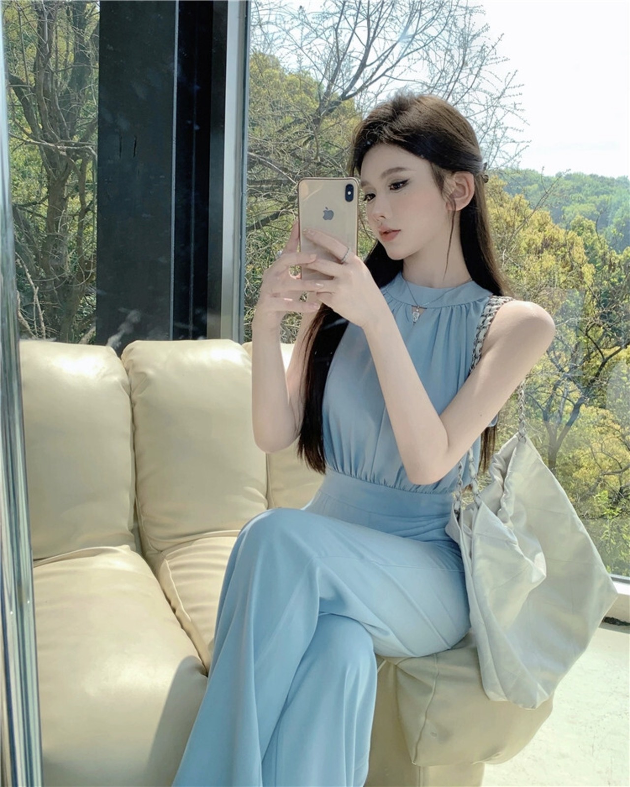 夏の気質ぶら下げネックノースリーブウエストスリムジャンプスーツ女性の感覚アウターワイドレッグジャンプスーツ長ズボン ロング サマー 夏物 ワイドパンツ nana49756734793 | modepoisson