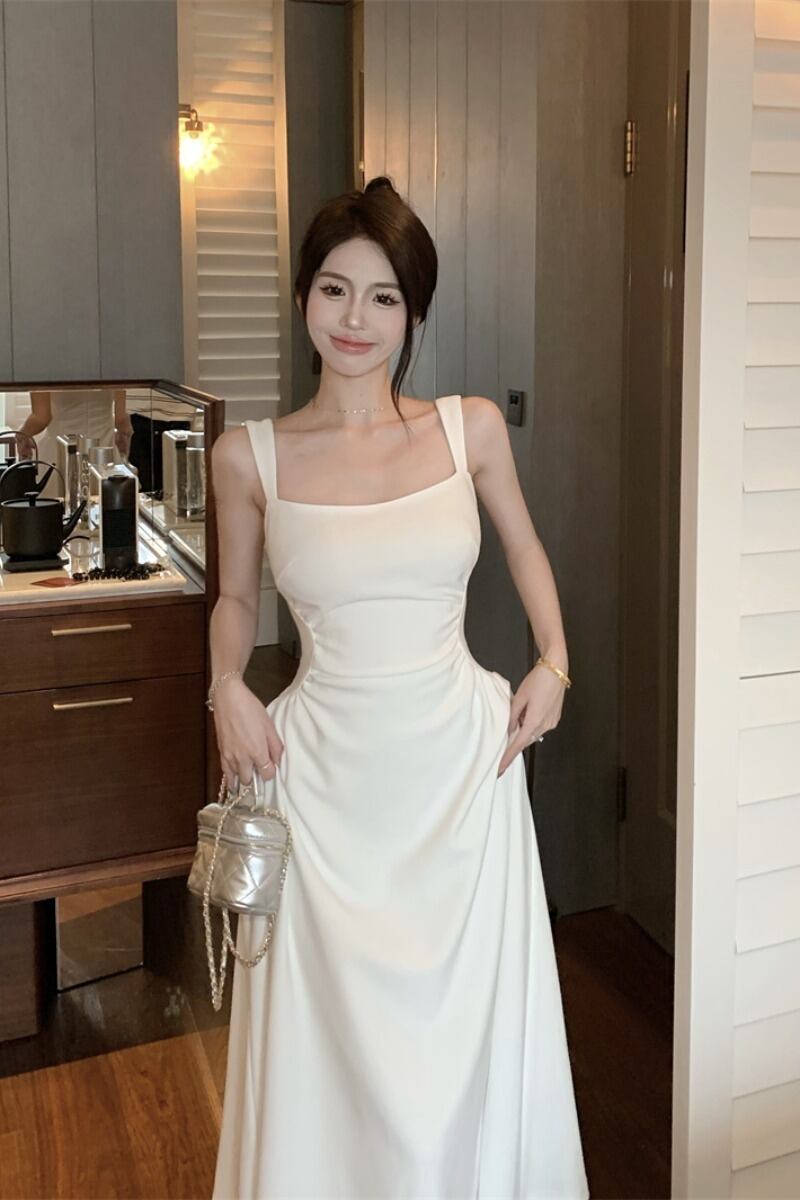 白サスペンダードレスフレンチスタイルウエストニッチデザインシックな気質ロングスカート女性の夏の2023新しいスタイル ホワイト サマー 夏物 nana15995668678 | modepoisson