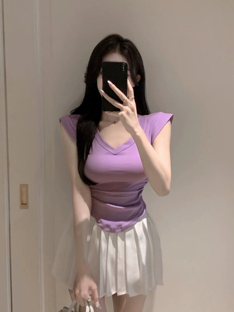 半袖 tシャツ 2023 夏の新オールマッチ純粋な欲望ウエスト痩身 v ネックプリーツショートインウィンドトップ女性 サマー 夏物 Vネック ピュア nana19229442550 | modepoisson