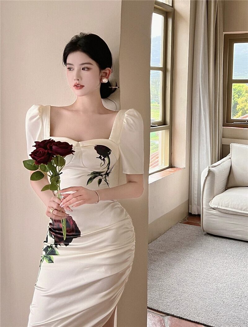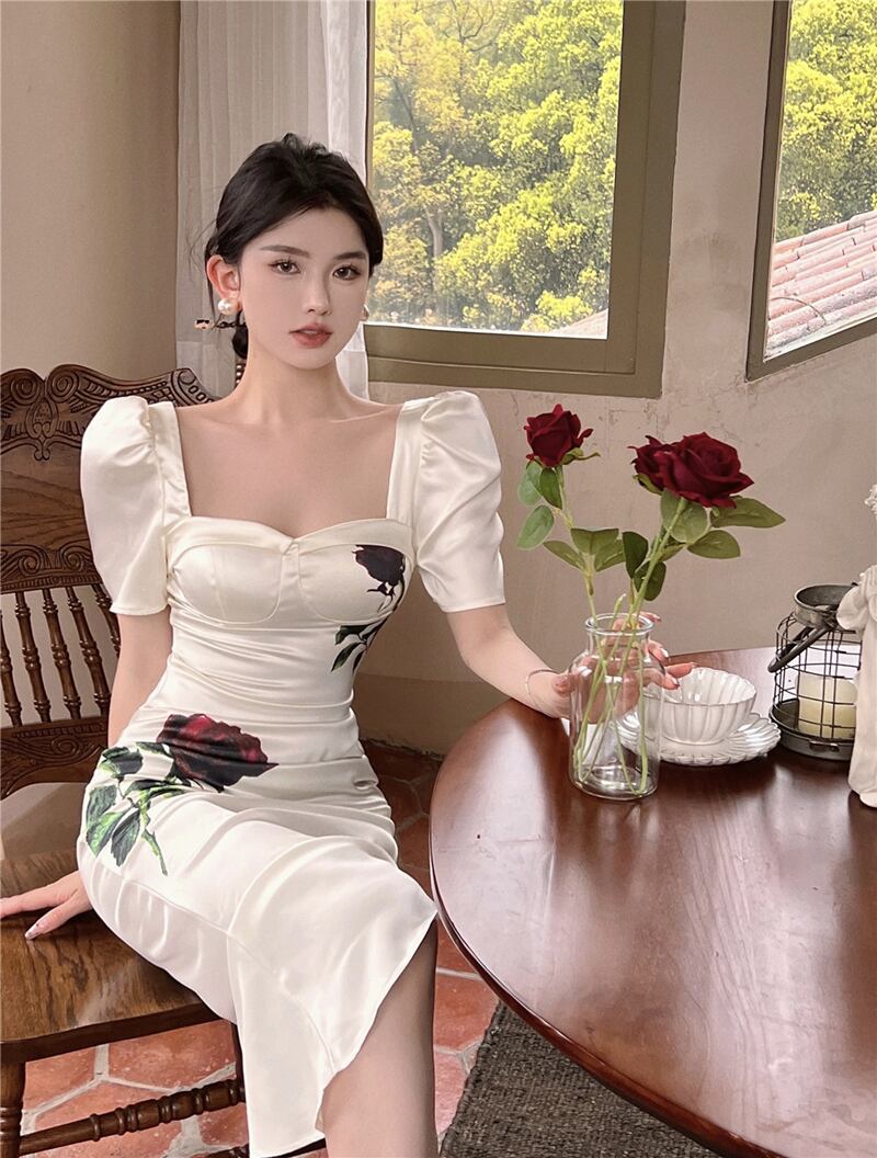 フランスのセレブ気質スクエアカラードレス女性 2023 夏の新しいパフスリーブローズフラワーウエストスリットスカート サマー 夏物 フラワーデザイン スクウェア nana1046201422 | modepoisson