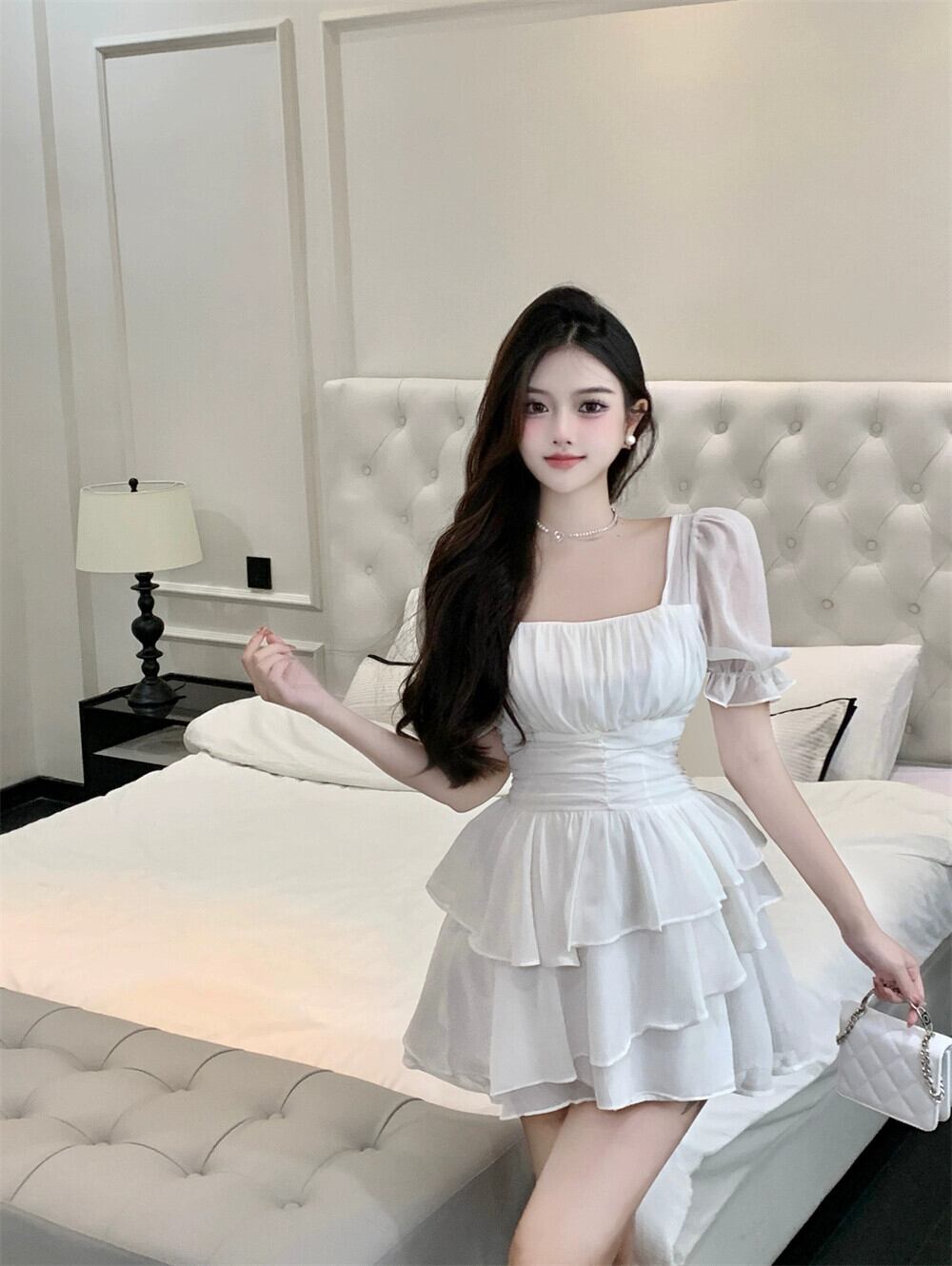 フレンチスタイルの白ティーブレークスクエアカラーふわふわドレス女性の夏の新しいスリムパフスリーブウエスト気質ショートスカート ホワイト サマー 夏物 スクウェア nana93714811442 | modepoisson