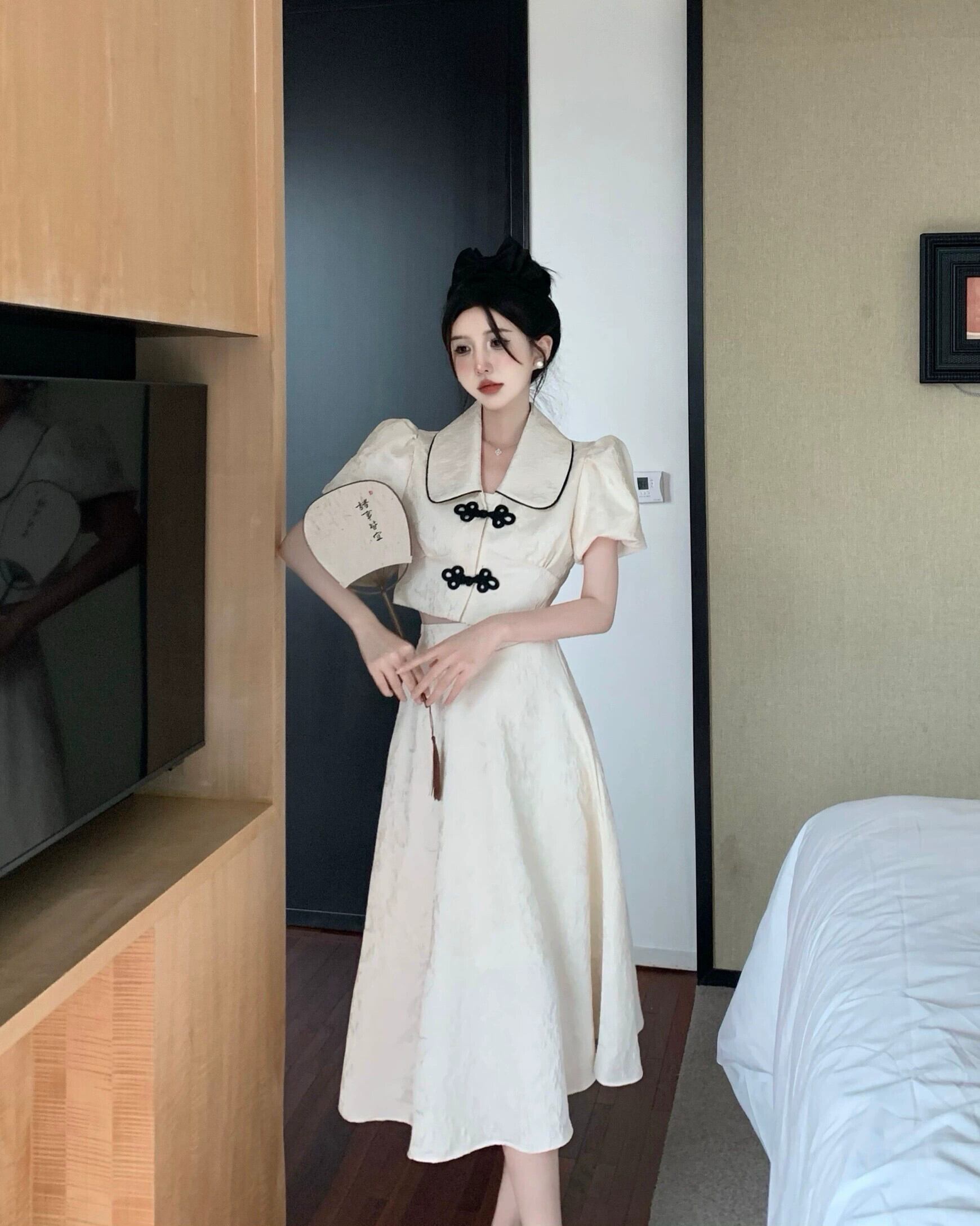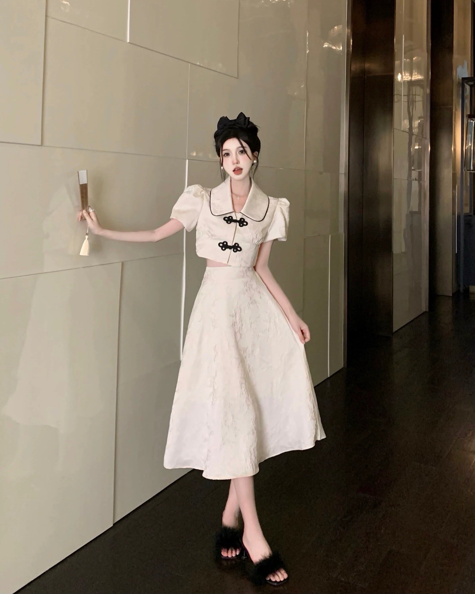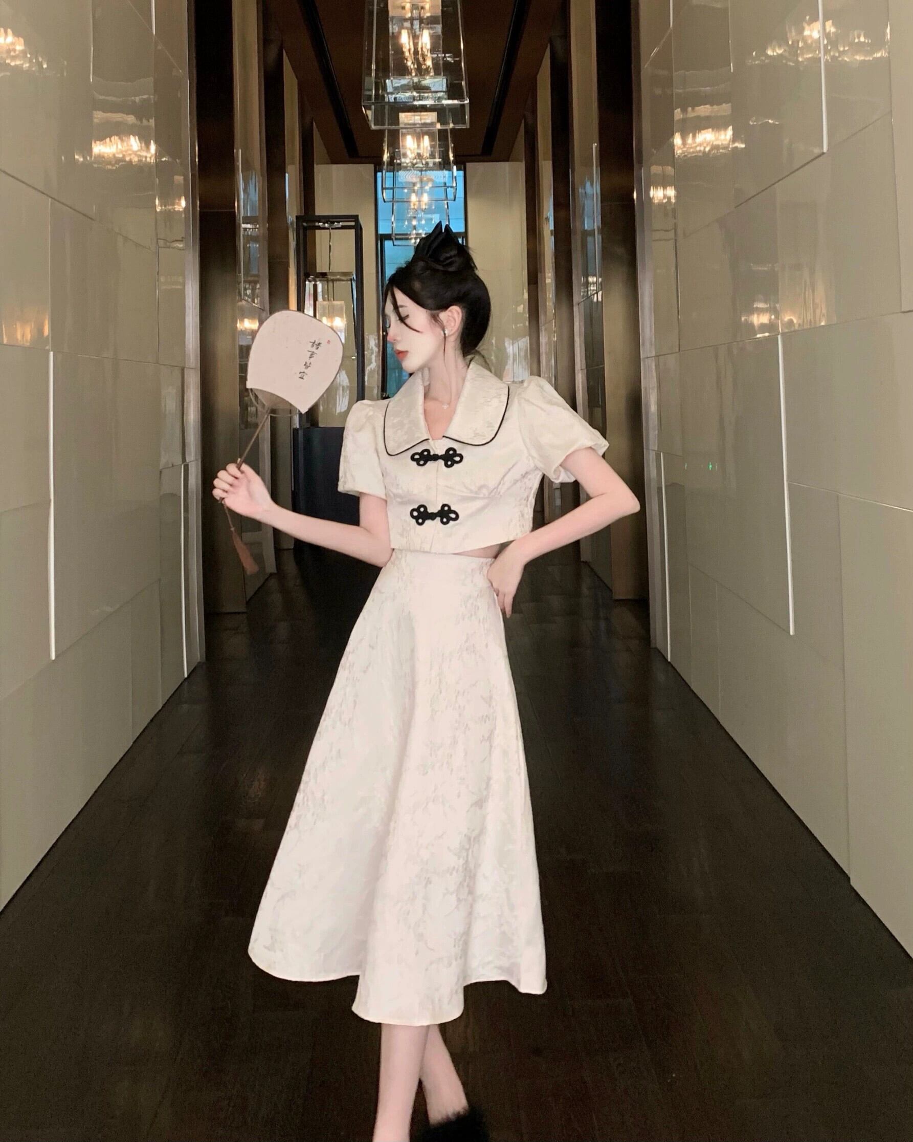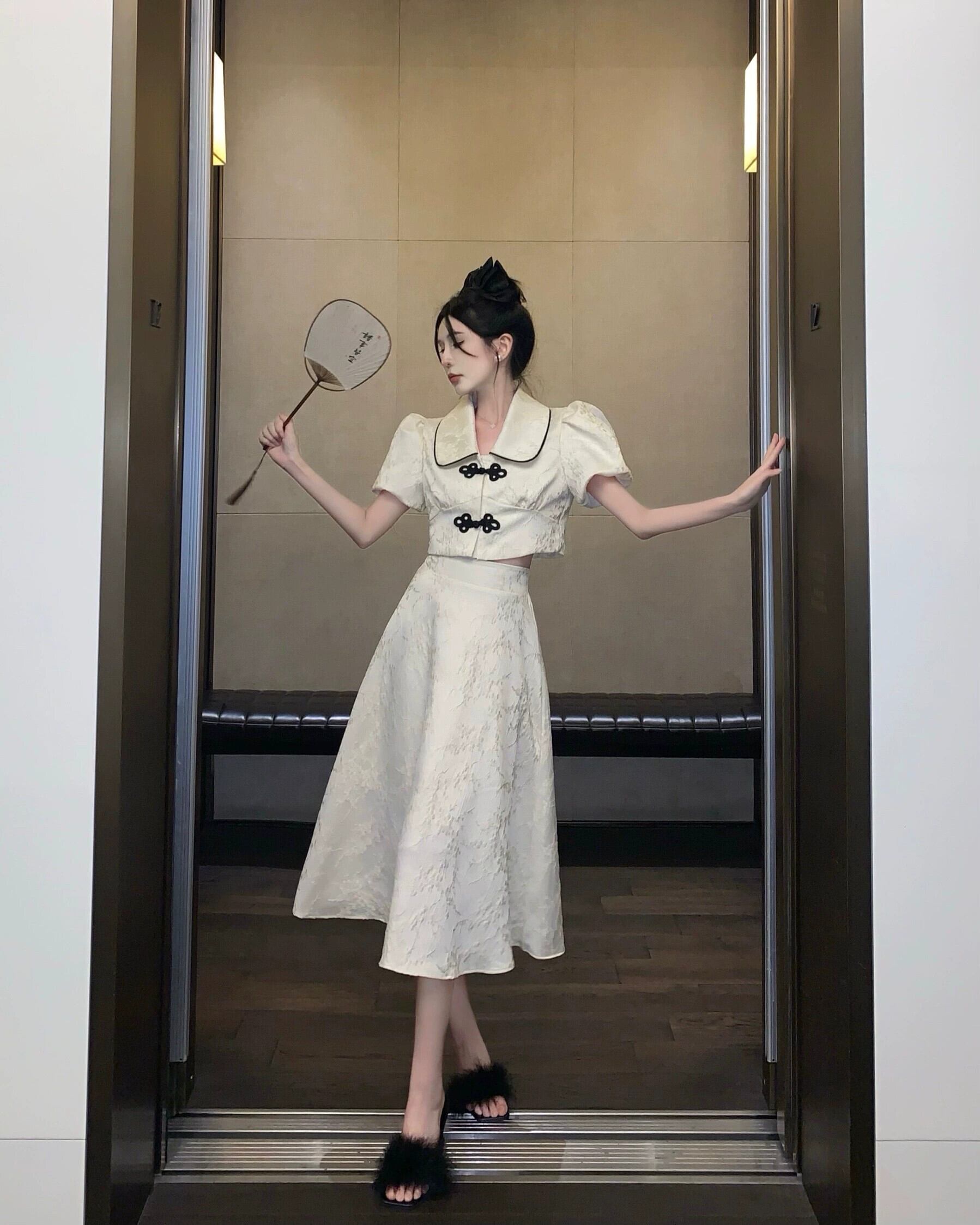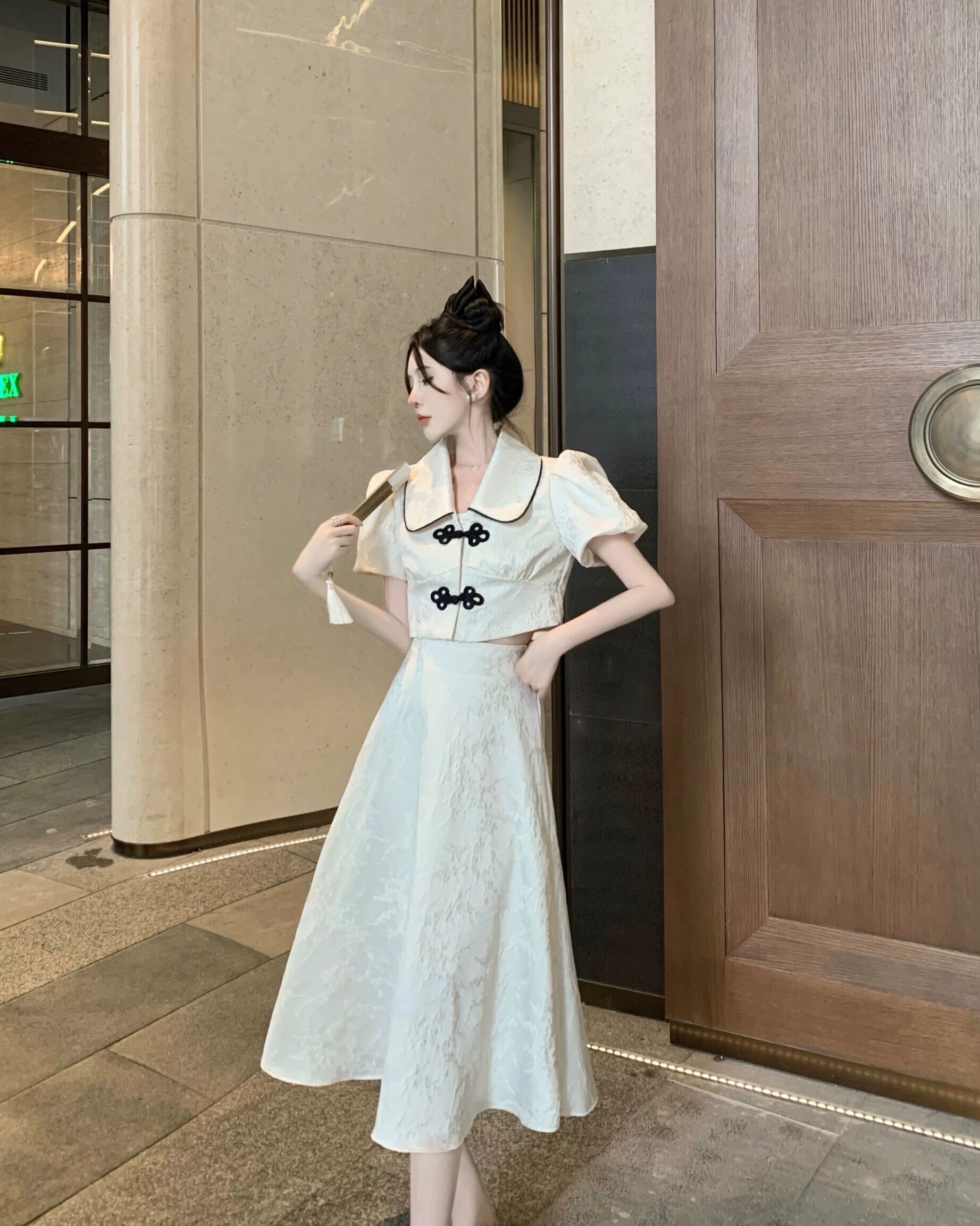 改良されたチャイナドレス中国風バックルショートトップハイウエストスリムミッドレングススカート夏のツーピーススーツ女性 ハイウェスト サマー 夏物 nana65247023281 | modepoisson