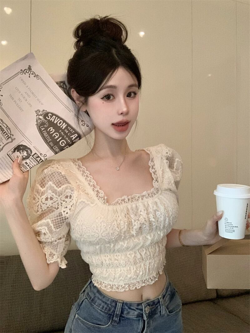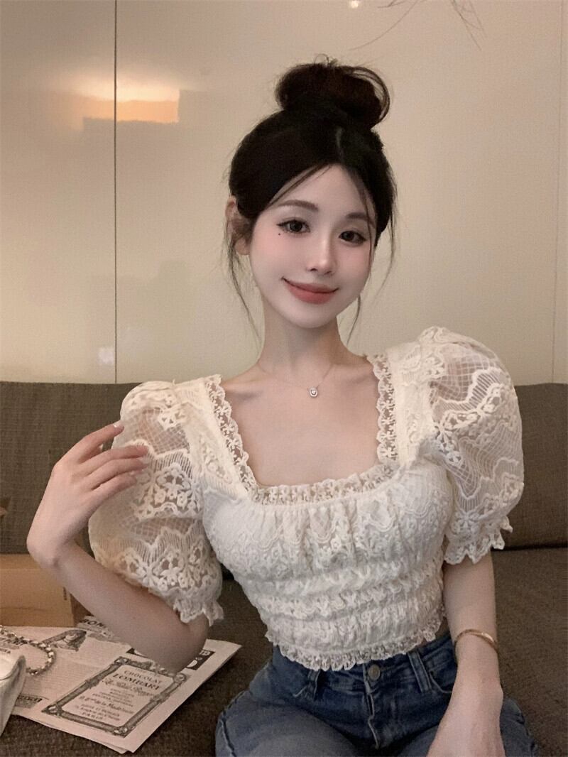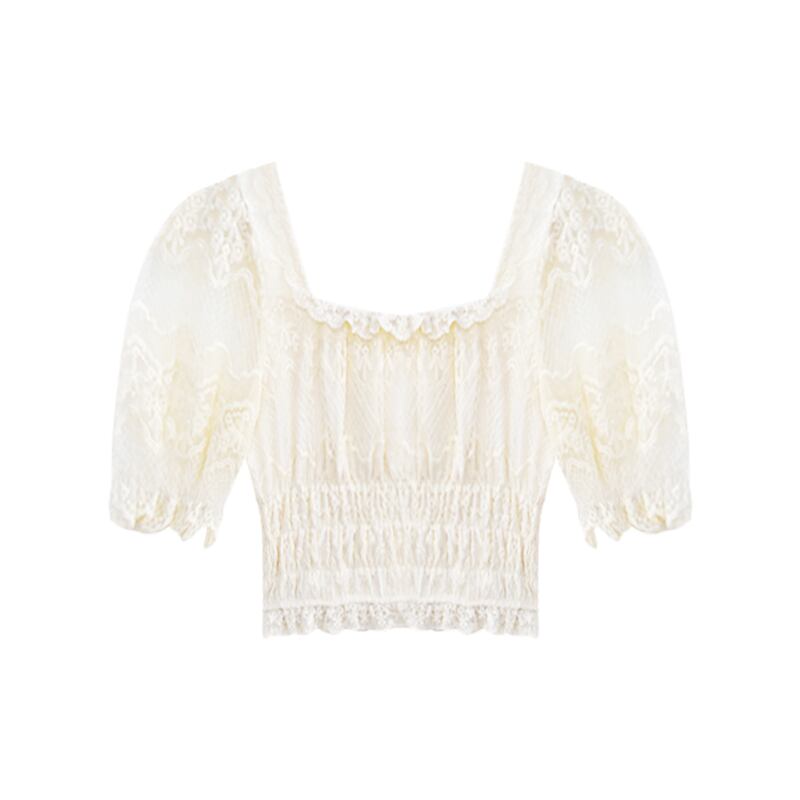 スイートレトロスクエアカラー半袖シフォンシャツレディース夏パフスリーブレースかぎ針編み優しいスリムショートトップ 大人ガーリー スウィート キュート カジュアル サマー 夏物 スクウェア nana59366852022 | modepoisson