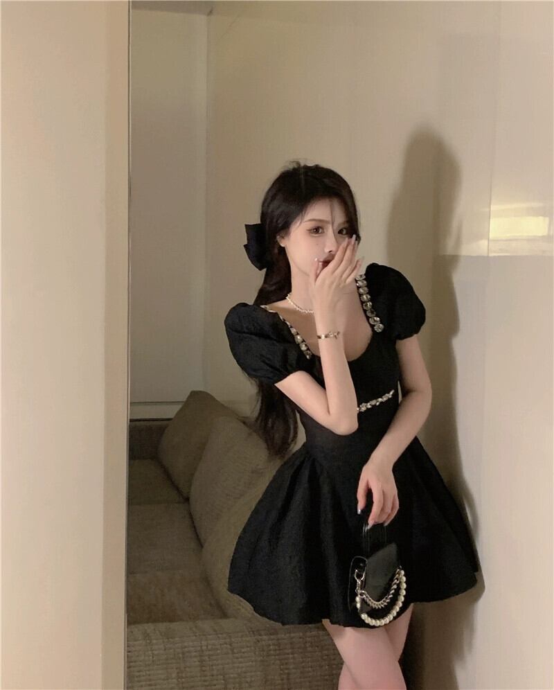 ダイヤモンドがちりばめられたスクエアカラーパフスリーブブラックドレスレディース 2023 夏の新作ウエスト痩身スカートシックなスカート サマー 夏物 スクウェア nana18171969814 | modepoisson