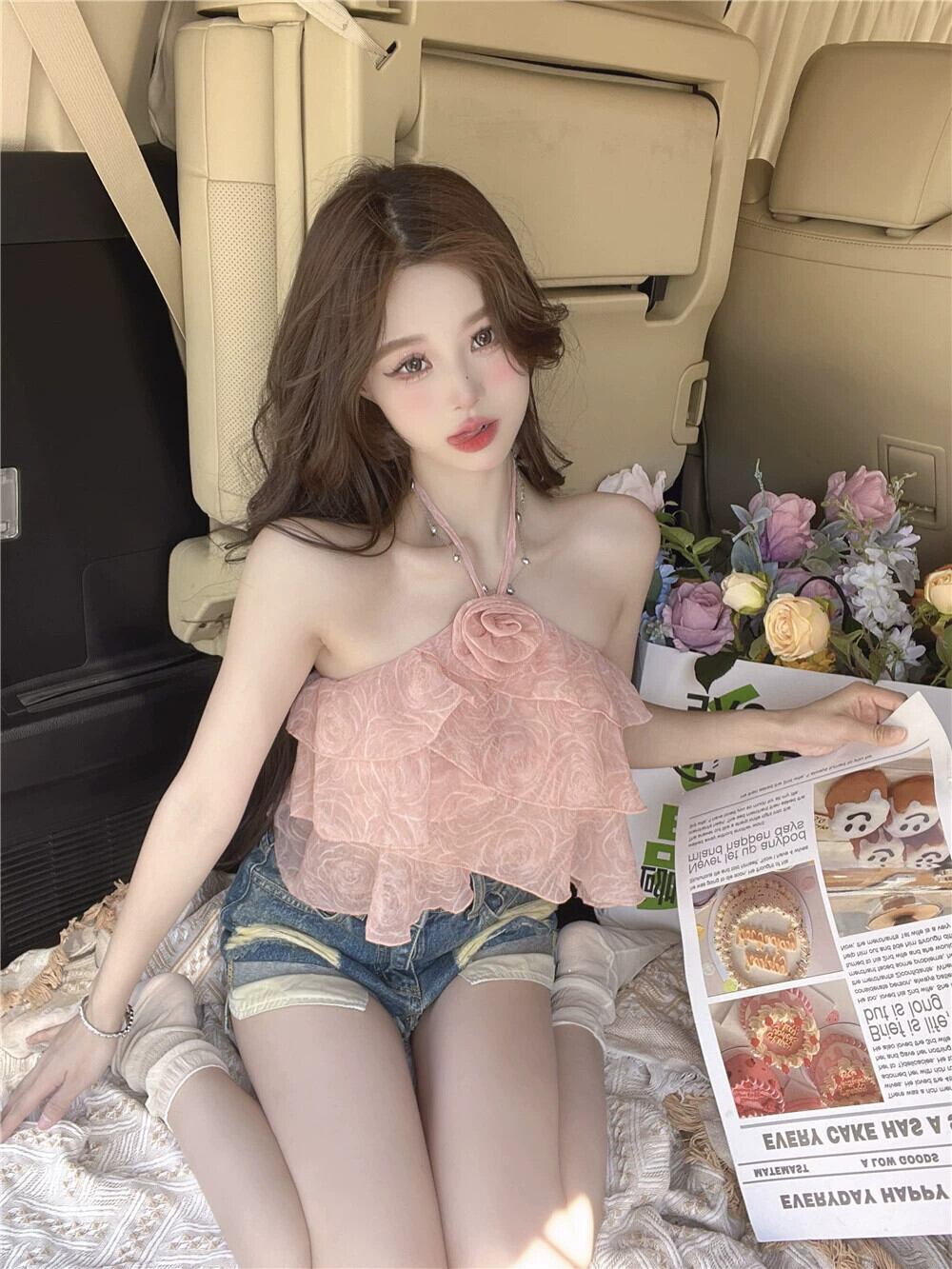 フレンチローズフラワーぶら下げネック小さなキャミソール女性の夏ニッチ甘辛トップスデザインフリル感 ラッフル 大人ガーリー スウィート キュート カジュアル サマー 夏物 フラワーデザイン nana26312152685 | modepoisson