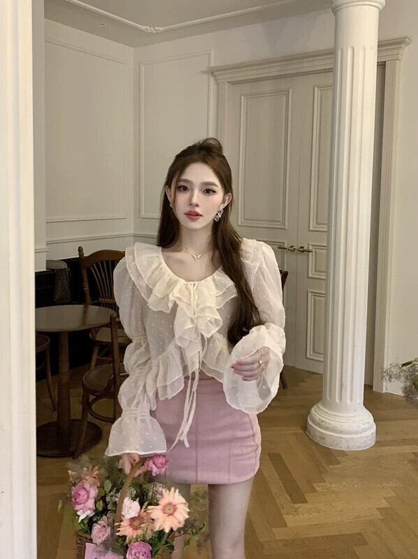 フレンチスタイルの優しく甘いVネックシフォンシャツレディース夏パフスリーブショートトップス長袖フリルカーディガン ロング 大人ガーリー スウィート キュート カジュアル サマー 夏物 nana55029417396 | modepoisson
