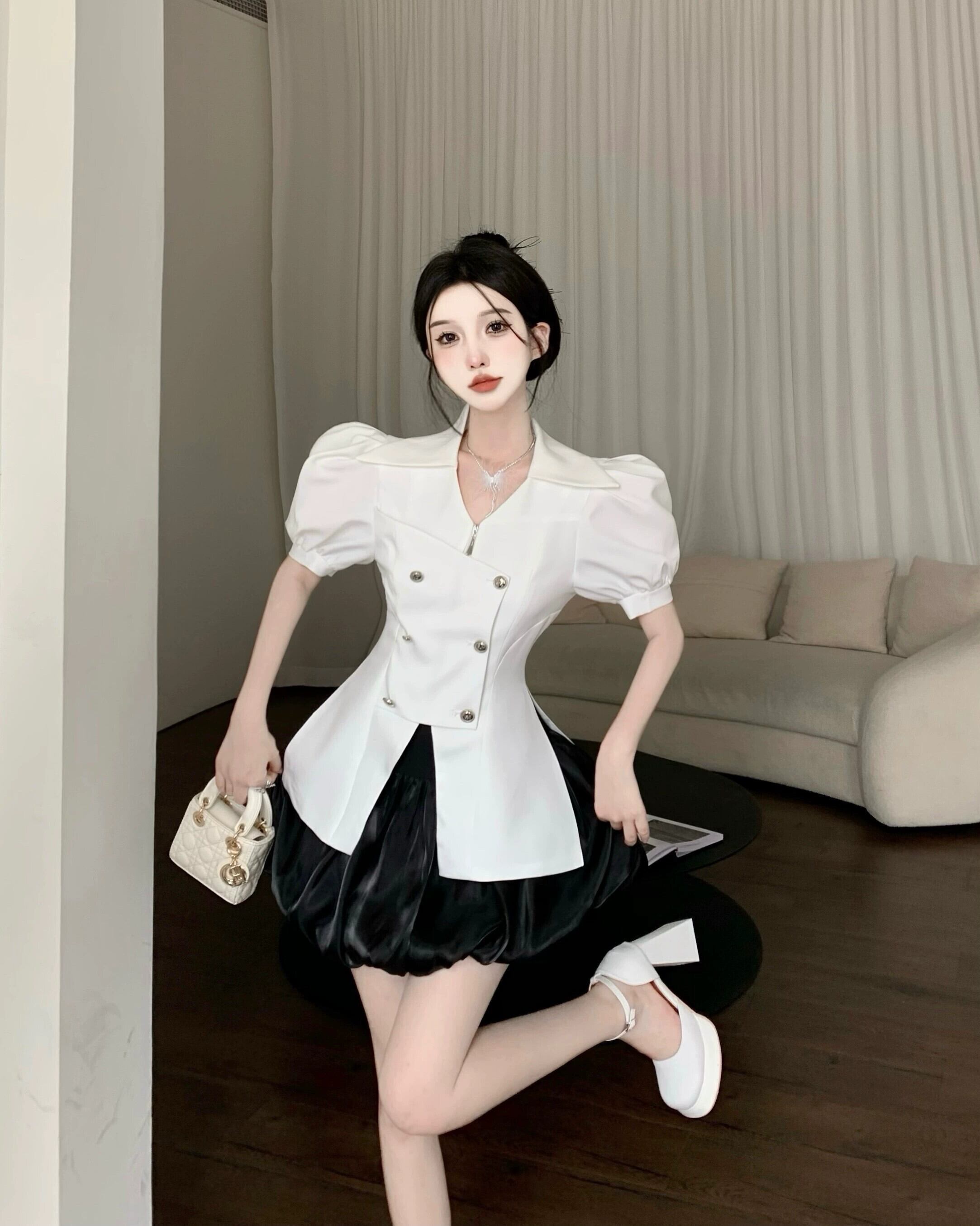 -エンドスーツスカートレディースフレンチスタイルスリムウエストトップハイウエストスカート夏の気質ツーピーススーツ ハイウェスト サマー 夏物 nana45181413076 | modepoisson