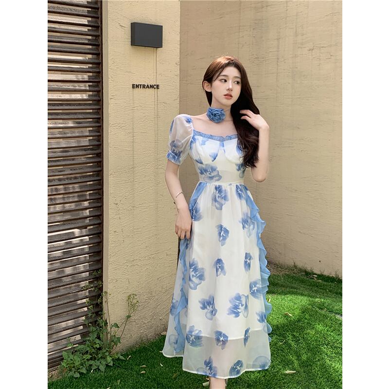 フレンチスイートウエストドレス女性の夏の2023新しいスリム気質ロングスカートパフスリーブプリント妖精スカート 大人ガーリー スウィート キュート カジュアル サマー 夏物 nana59438521542 | modepoisson