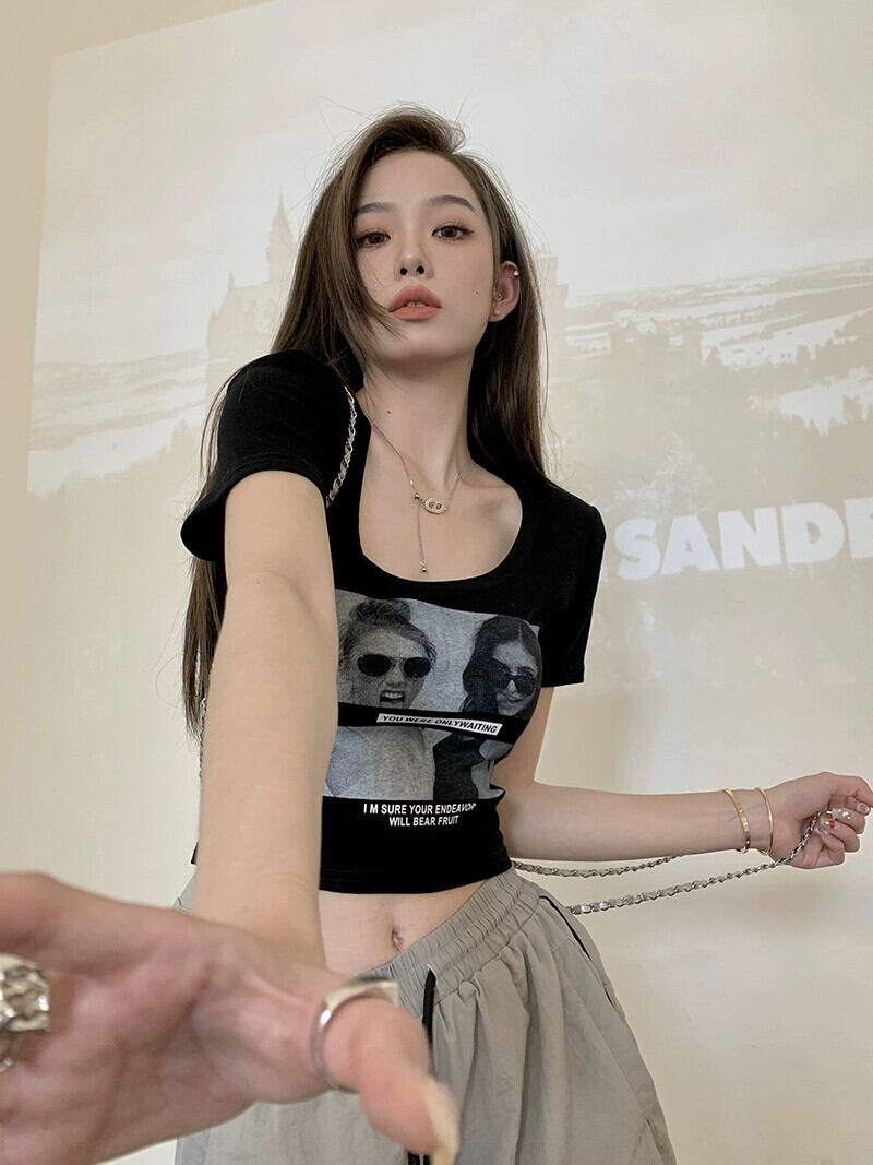 アメリカンレトロプリント半袖Tシャツ女性スクエアカラーショートセクションニッチデザインシックなショルダーパッドトップ夏 サマー 夏物 スクウェア nana3007194248 | modepoisson