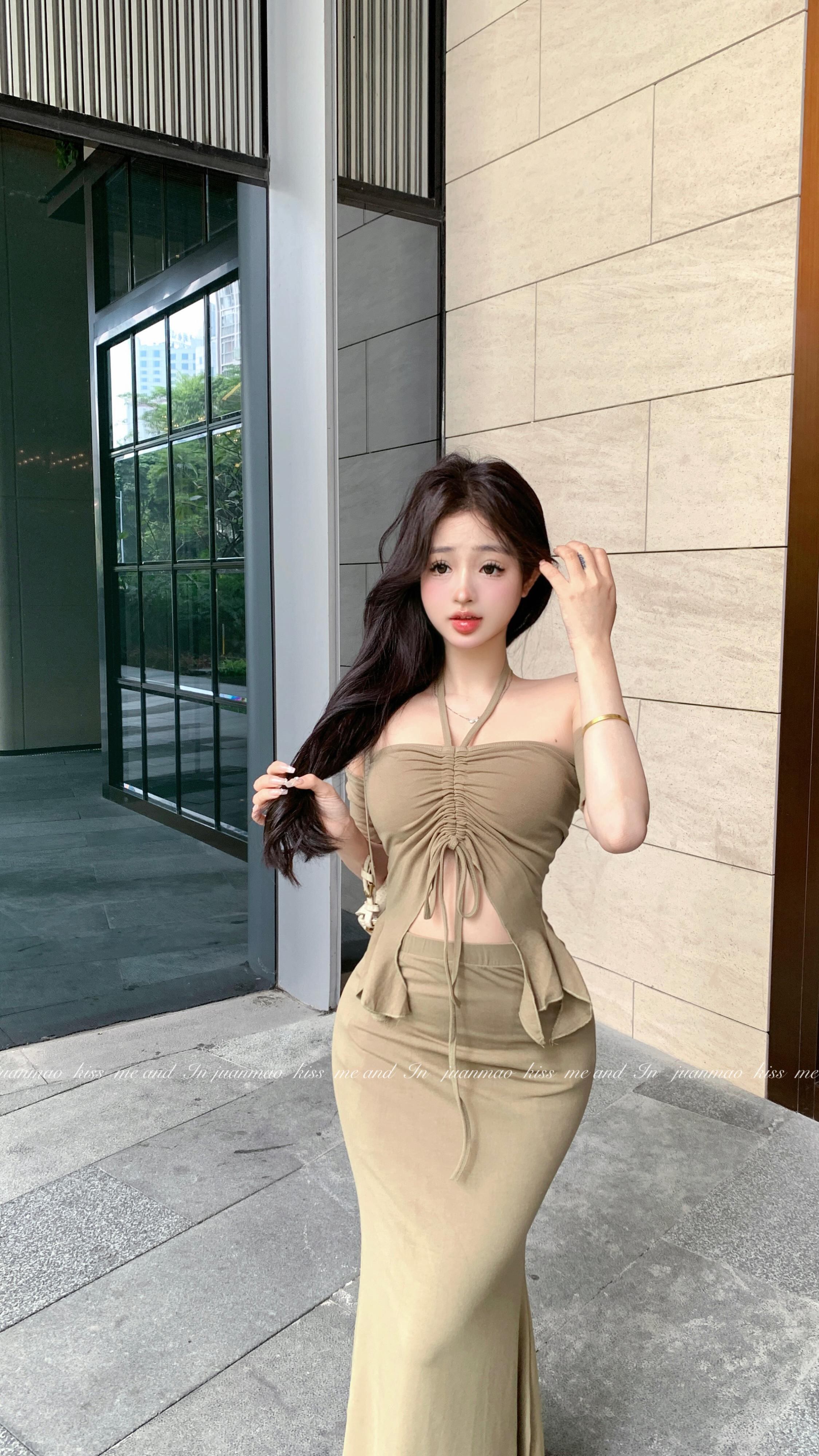 純粋な欲望吊りネック半袖トップスーツ女性の夏のハイウエストバッグヒップミッドレングスのフィッシュテールスカート 2 点セット ハイウェスト サマー 夏物 nana24163416094 | modepoisson