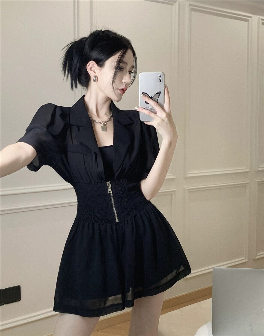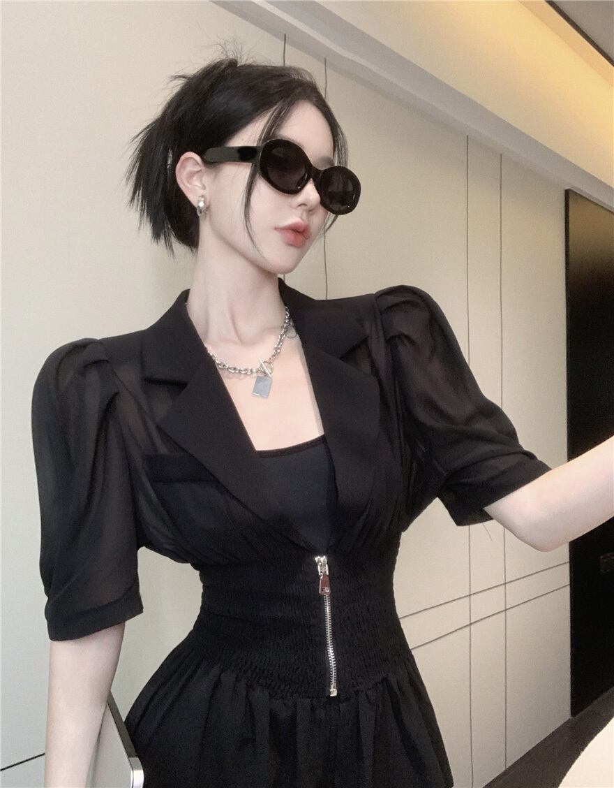 純赤気質ツーピーススーツ女性パフスリーブシフォンウエストドレス夏のハイウエストカジュアルワイドレッグショートパンツ ハイウェスト レッド サマー 夏物 ワイドパンツ nana17530607674 | modepoisson