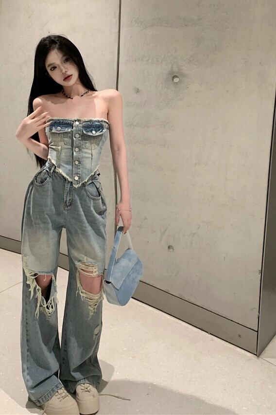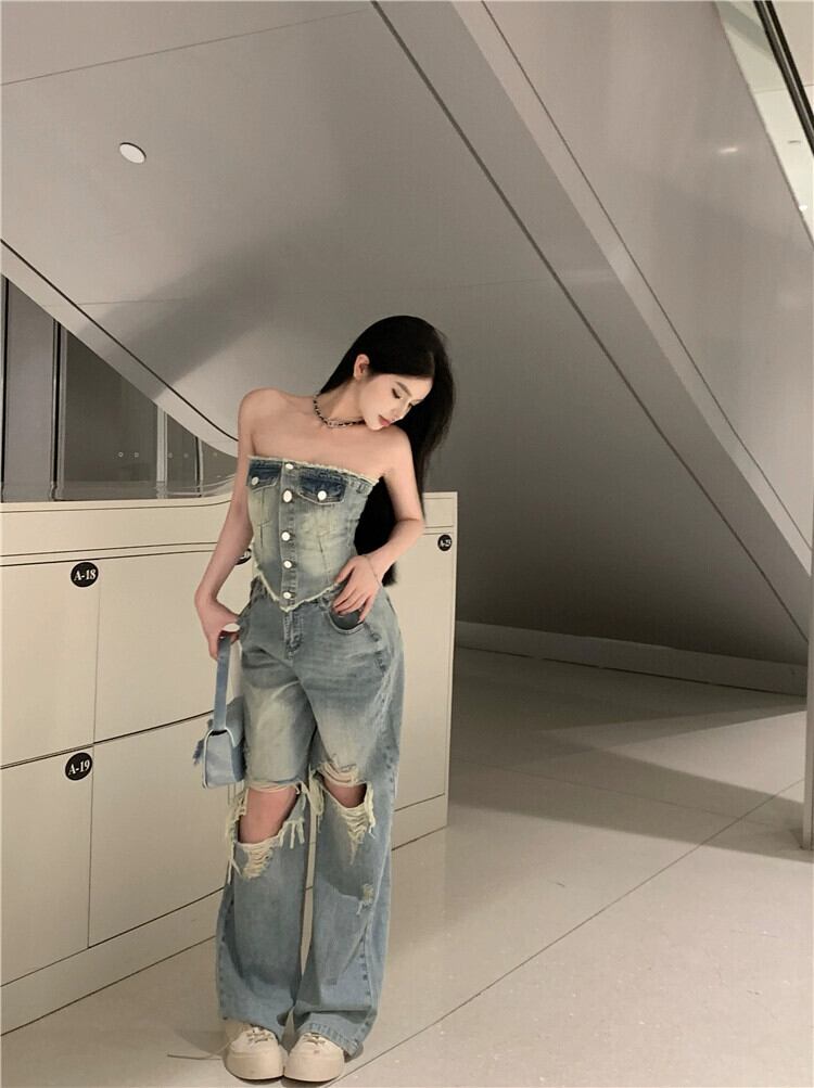 ヨーロッパとアメリカのレトロな気質のハイエンドの甘いスリムチューブトップ破れたジーンズファッションサマースーツ女性 大人ガーリー スウィート キュート カジュアル 夏物 ヨーロピアン nana17638587493 | modepoisson