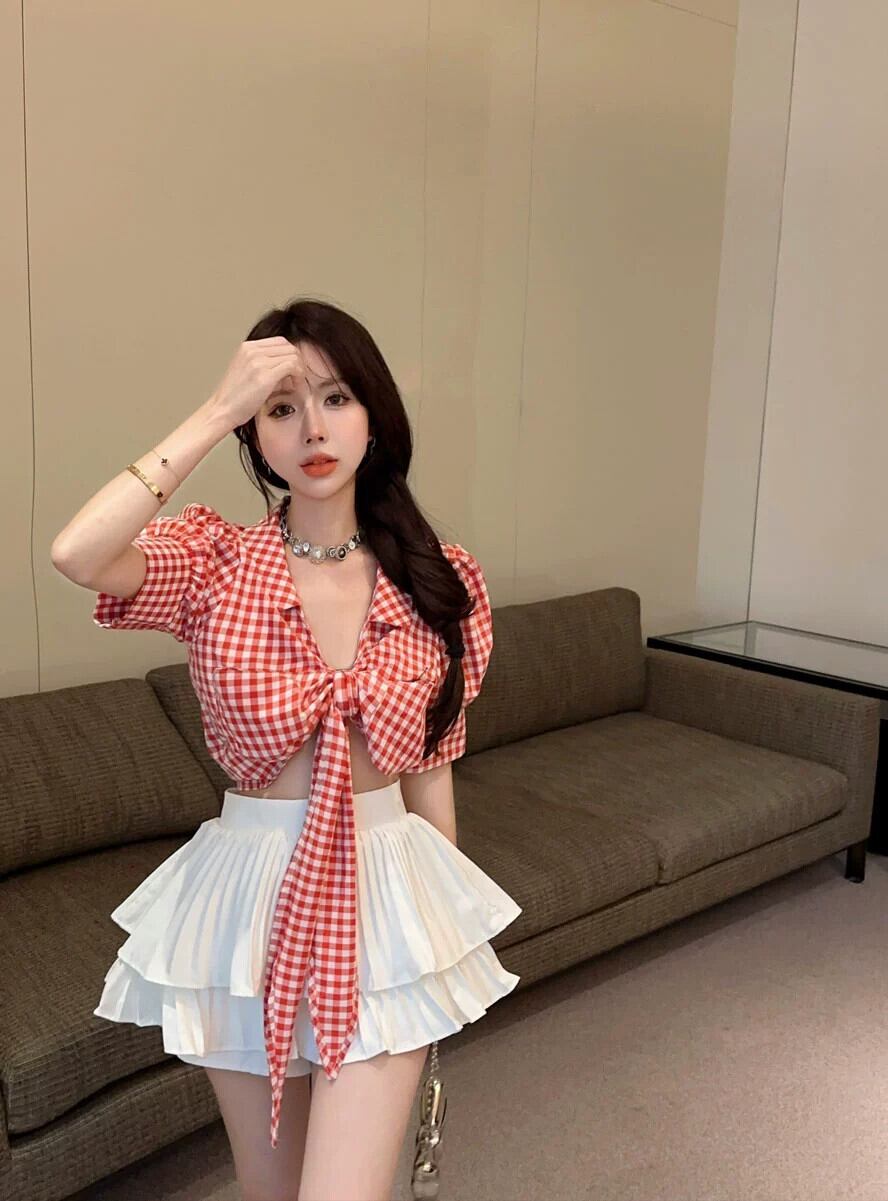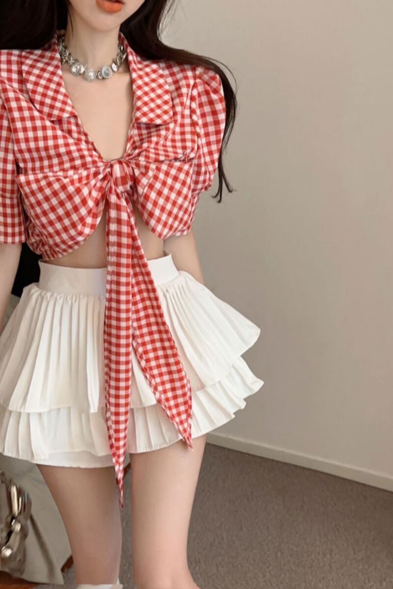 ウエストセクシーなストラップチェック柄シャツデザインニッチシックなトップ甘くてスパイシーなスーツ女性ふわふわスカート夏 大人ガーリー スウィート キュート カジュアル サマー 夏物 nana72085800588 | modepoisson