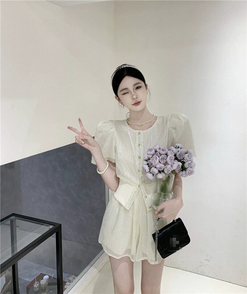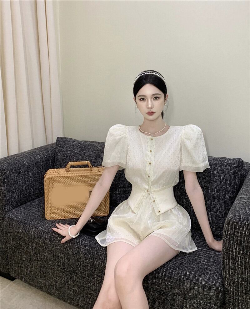 フランスのセレブ気質のスーツの女性の夏の新作パフスリーブシャツトップハイウエストワイドレッグショーツ2点セット ハイウェスト サマー 夏物 ブルマー ワイドパンツ nana20461502681 | modepoisson