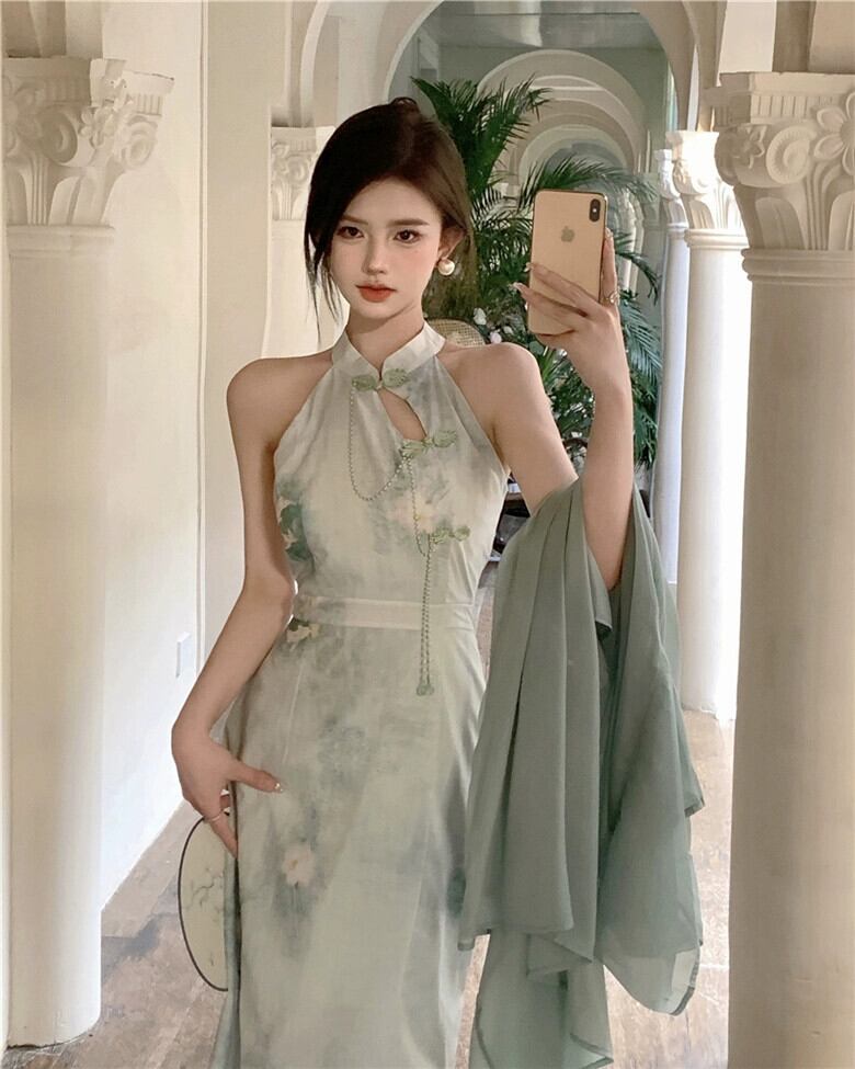ぞっとするような禅のチャイナドレスの女性の夏のスリットスリムフィットスリムバッグヒップスカート気質ハンギングネックウエストウエストドレス サマー 夏物 nana73783022347 | modepoisson