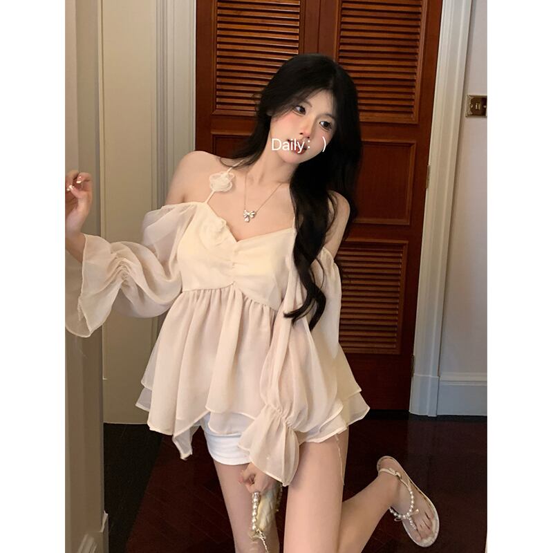 フランスのワンショルダー長袖シフォンシャツニッチ甘いフリル甘いスパイシーな風日焼け止めスリングトップ夏の女性 ロング 大人ガーリー スウィート キュート カジュアル サマー 夏物 nana53471289308 | modepoisson
