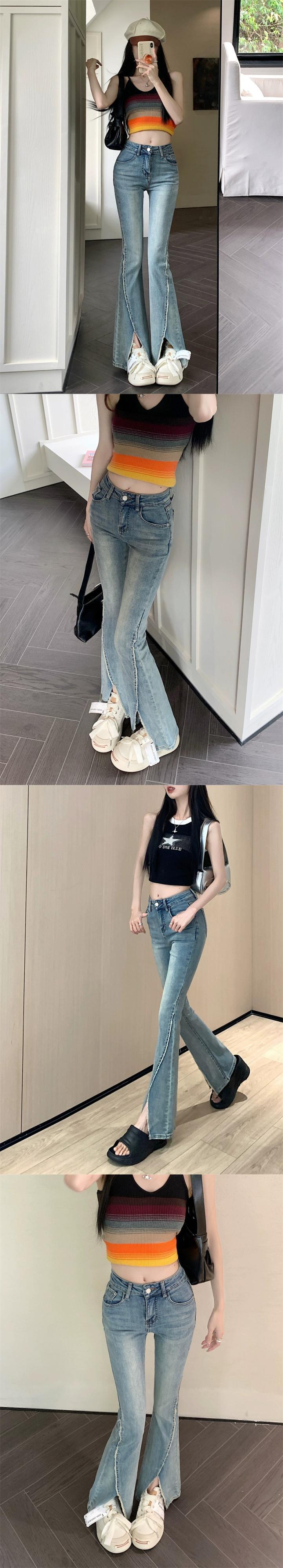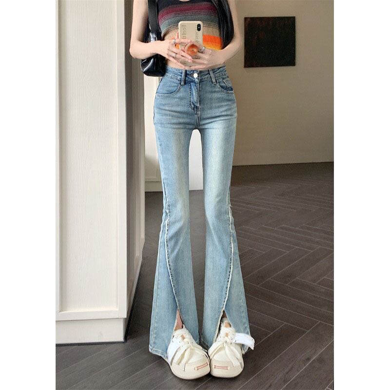 ストレートレトロわずかフレアジーンズ女性の夏の 2023 新しいハイウエスト痩身パンツデザインセンススリットフレアパンツ ハイウェスト レッド サマー 夏物 nana27780952603 | modepoisson