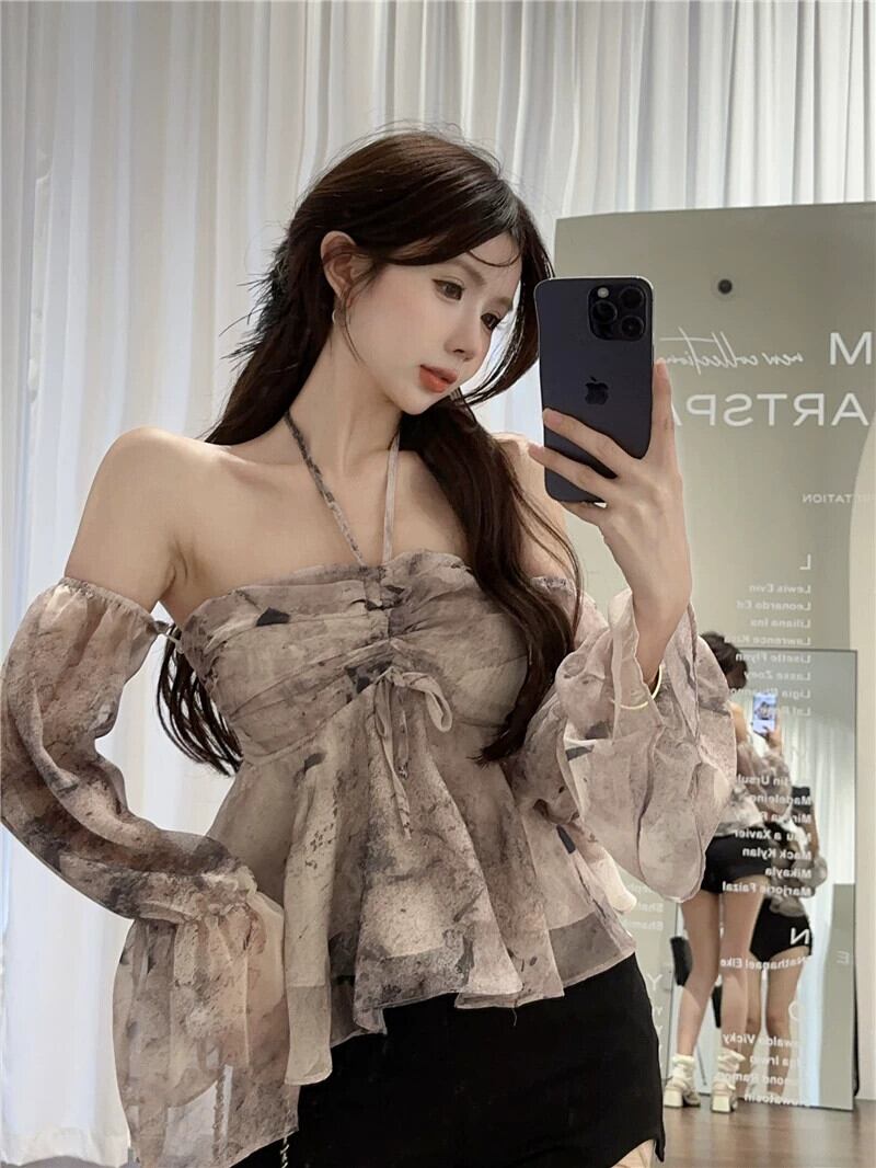フランスのデザインセンスニッチシックな美しいハンギングネックプリントストラップレス長袖シフォンシャツ夏の新しいトップ女性 ロング サマー 夏物 nana47721954115 | modepoisson