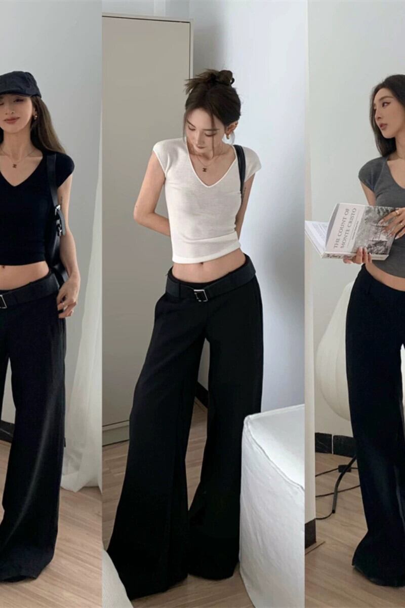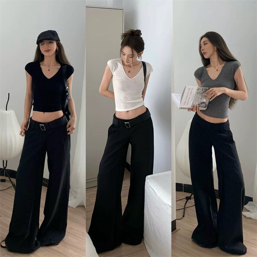 ホットスリムニット半袖トップハイウエストワイドレッグカジュアルパンツスーツ女性 2023 新しい夏のツーピーススーツ ハイウェスト サマー 夏物 ワイドパンツ nana42050068396 | modepoisson