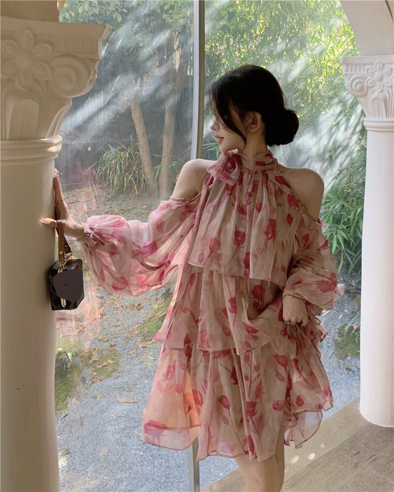 フランスのティーブレイク気質ドレス女性の夏のハイエンド甘い花柄ショートスカート長袖ニッチ妖精スカート ロング 大人ガーリー スウィート キュート カジュアル サマー 夏物 nana77929827258 | modepoisson