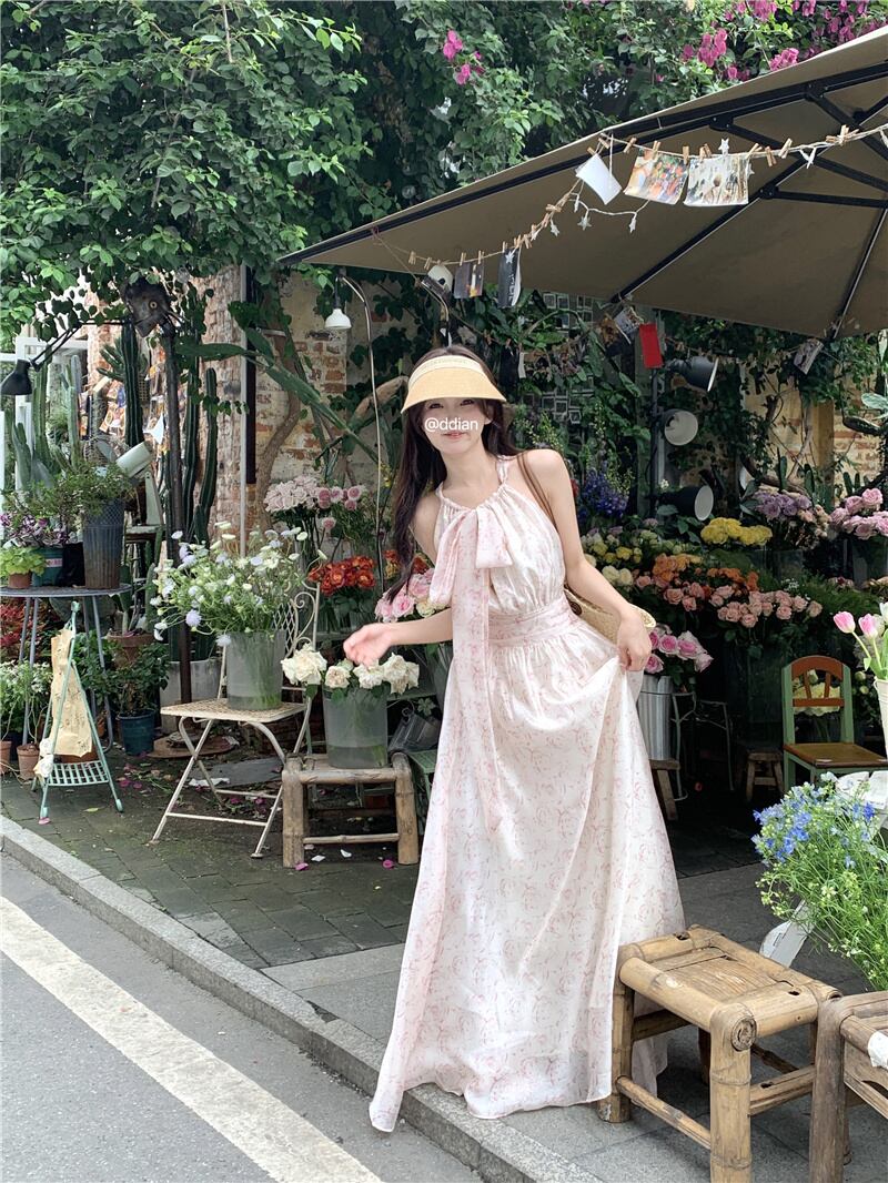 フレンチフローラルホルターネックドレス女性の夏の優しい風ノースリーブ甘いスカートボウノットウエストスリムロングドレス リボン 大人ガーリー スウィート キュート カジュアル サマー 夏物 花柄 nana89647768868 | modepoisson