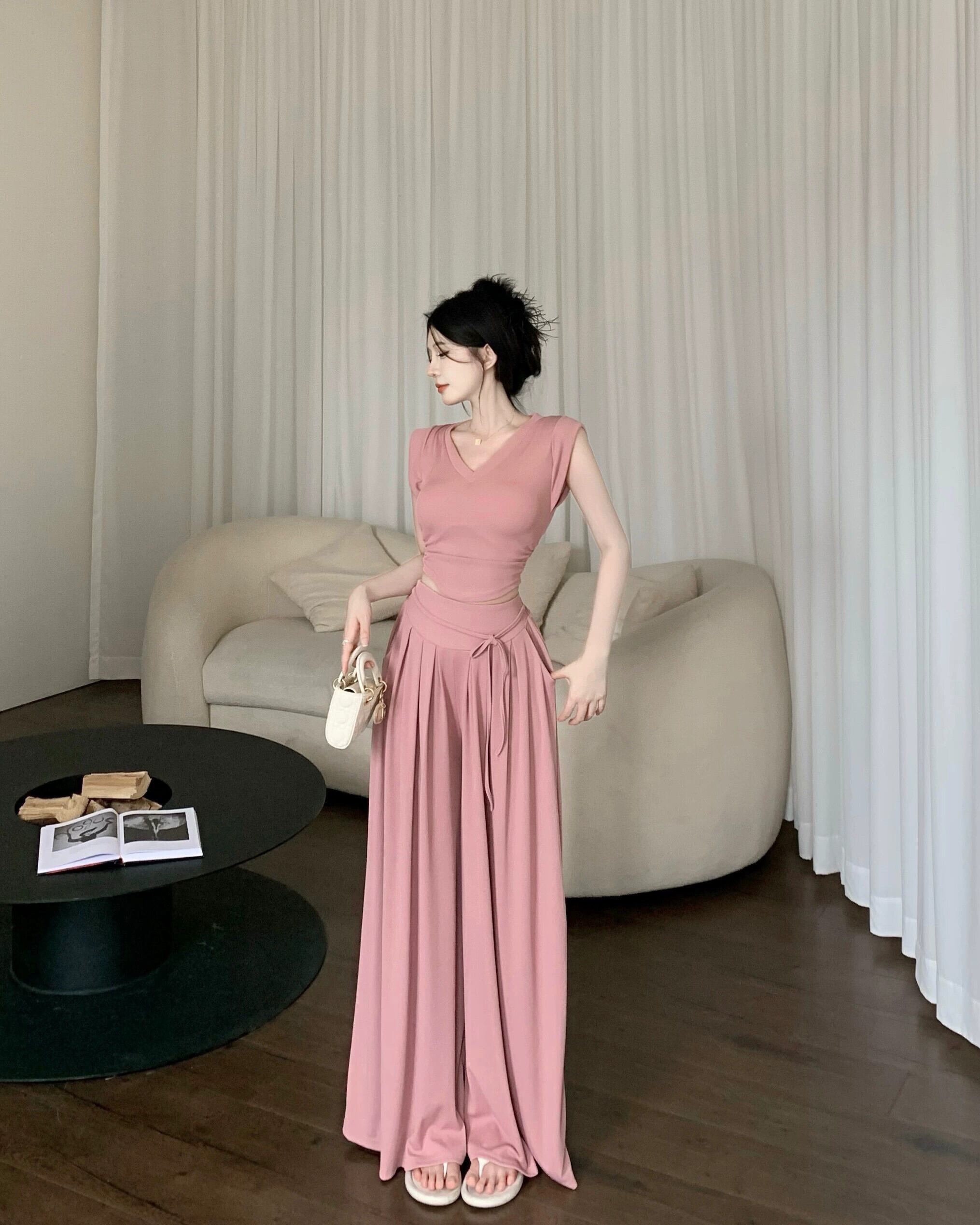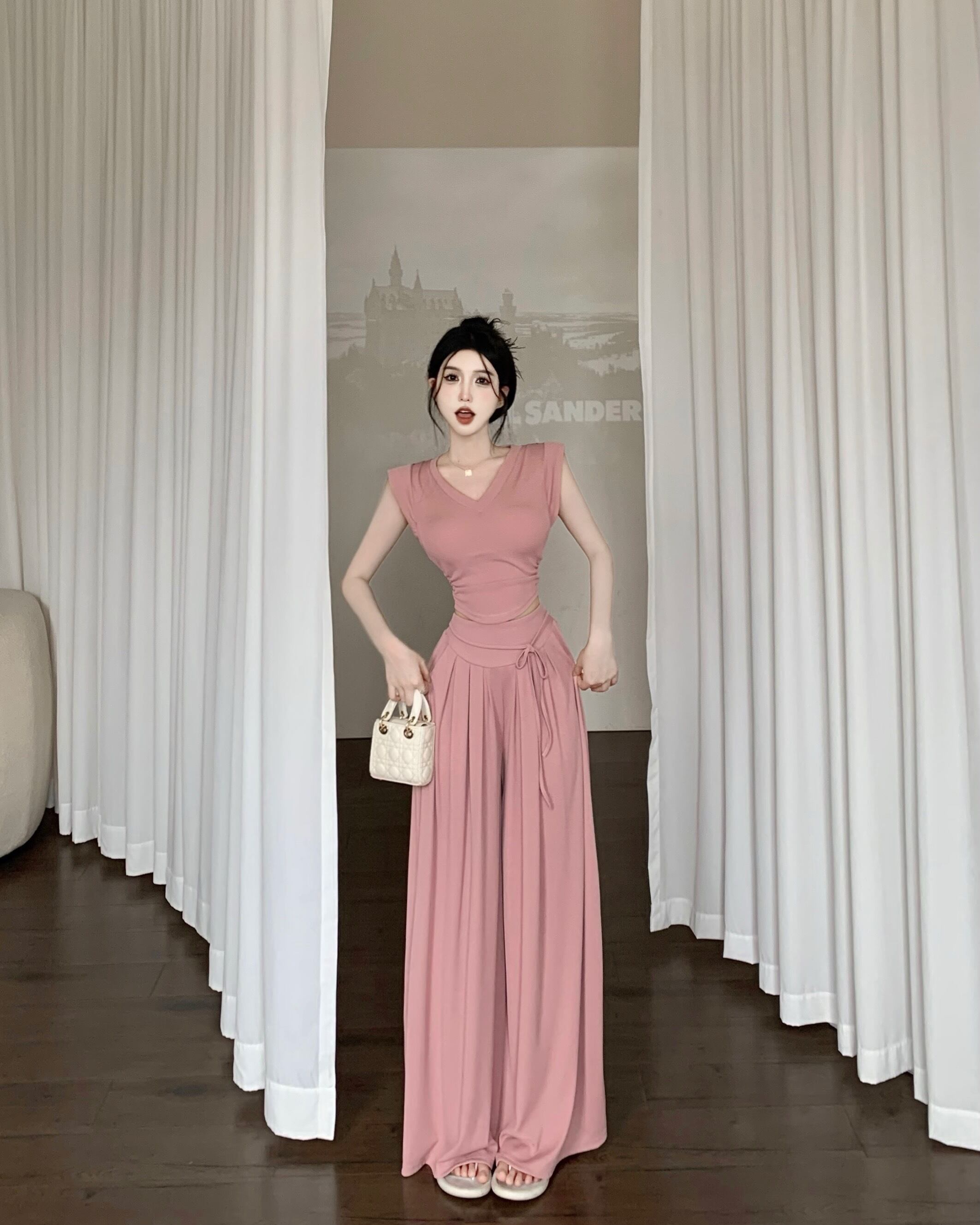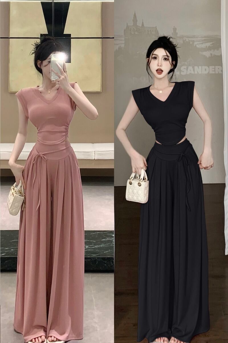 ストラップ付きウエスト縮小トップとワイドレッグパンツネットレッド2023フライドストリートスーツレディースカジュアルパンツモップスカートパンツ夏の2点セット サマー 夏物 nana61735150864 | modepoisson