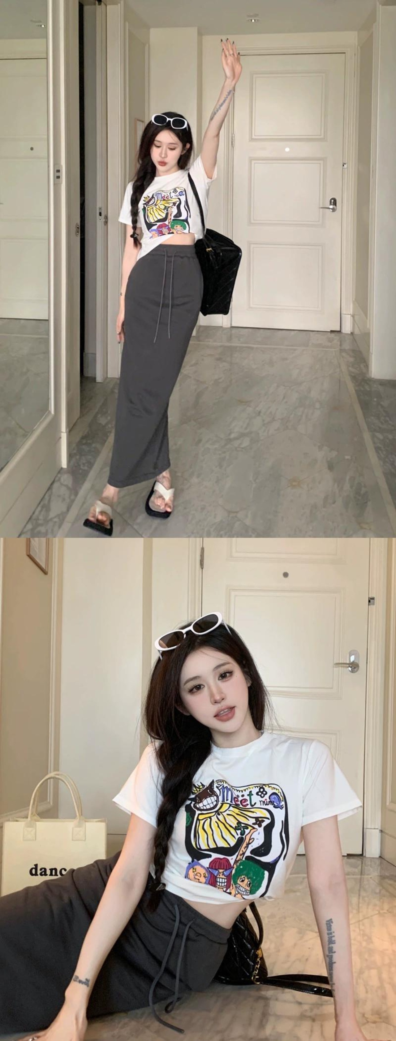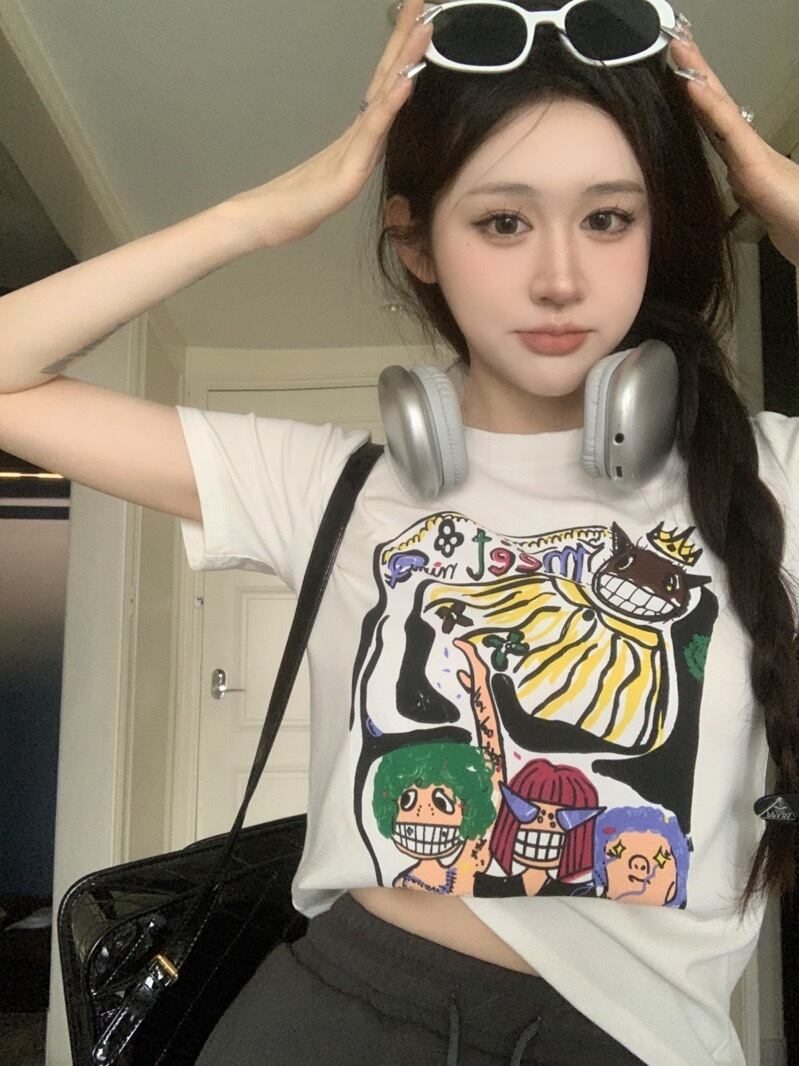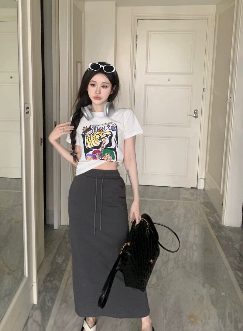 漫画プリント薄い半袖 tシャツサマースーツ女性のハイウエストスカートカジュアルロングスカートファッションツーピーススーツ ハイウェスト 夏物 nana20841457581 | modepoisson