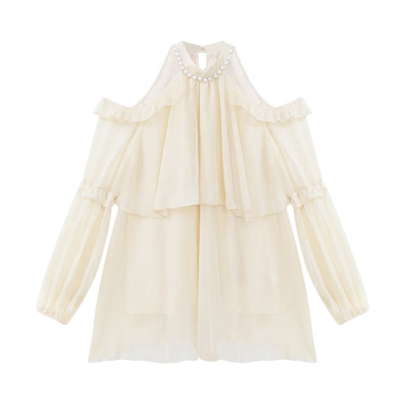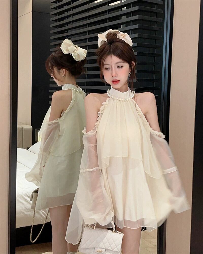 甘いフレンチホルターネック気質ドレス女性の夏のオフショルダー優しいショートスカートウエストセン部門メッシュ妖精スカート 大人ガーリー スウィート キュート カジュアル サマー 夏物 nana85854185363 | modepoisson