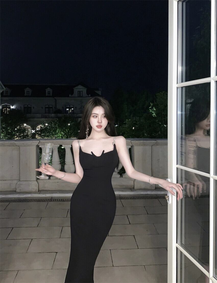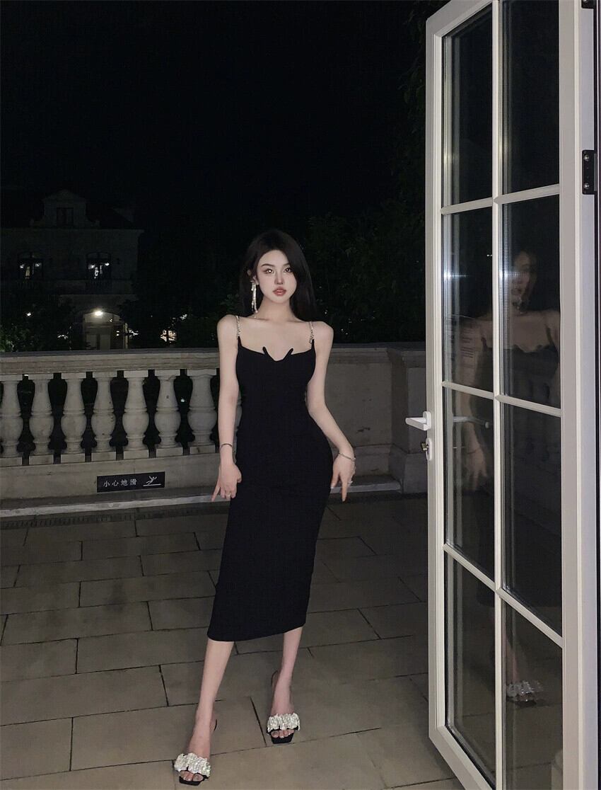 黒のロングサスペンダードレスの女性の夏の純粋な欲望スタイルのセクシーな底スカートデザインセンススリム気質スカート ブラック サマー 夏物 ピュア nana17468068949 | modepoisson