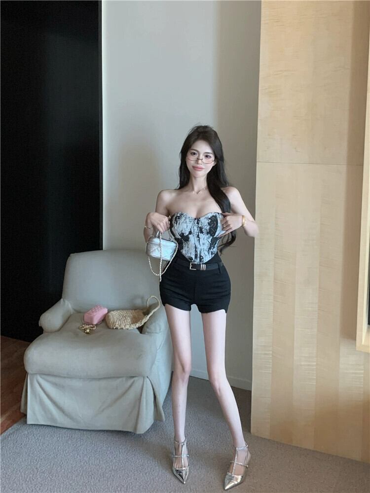 ホットガールショートチューブトップトップサマースーツウエストブラックストレートショーツ女性の甘くてスパイシーなスリムツーピースセット 大人ガーリー スウィート キュート カジュアル 夏物 ブルマー nana59145598015 | modepoisson