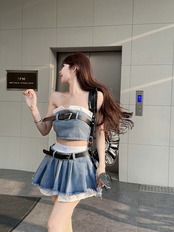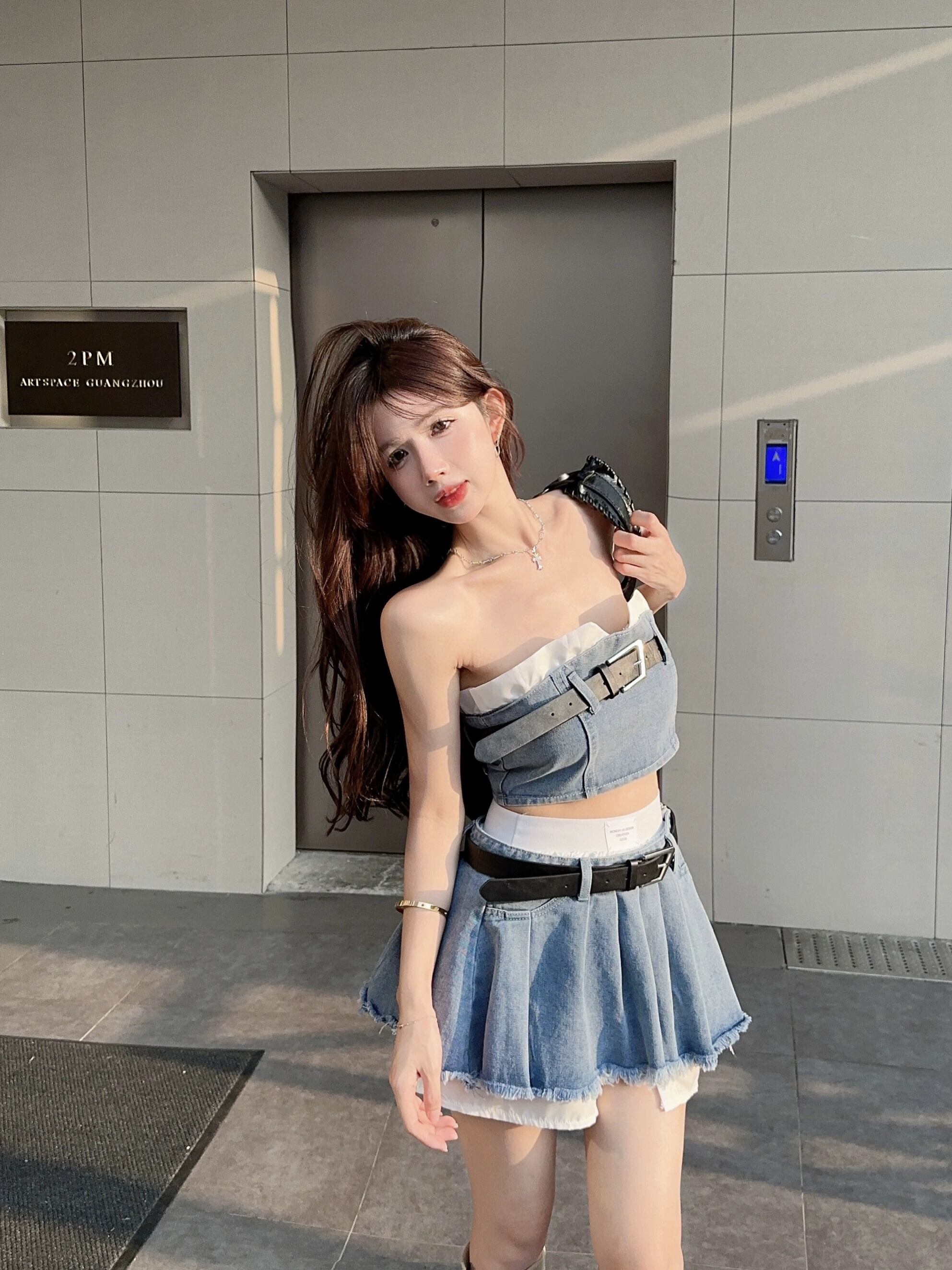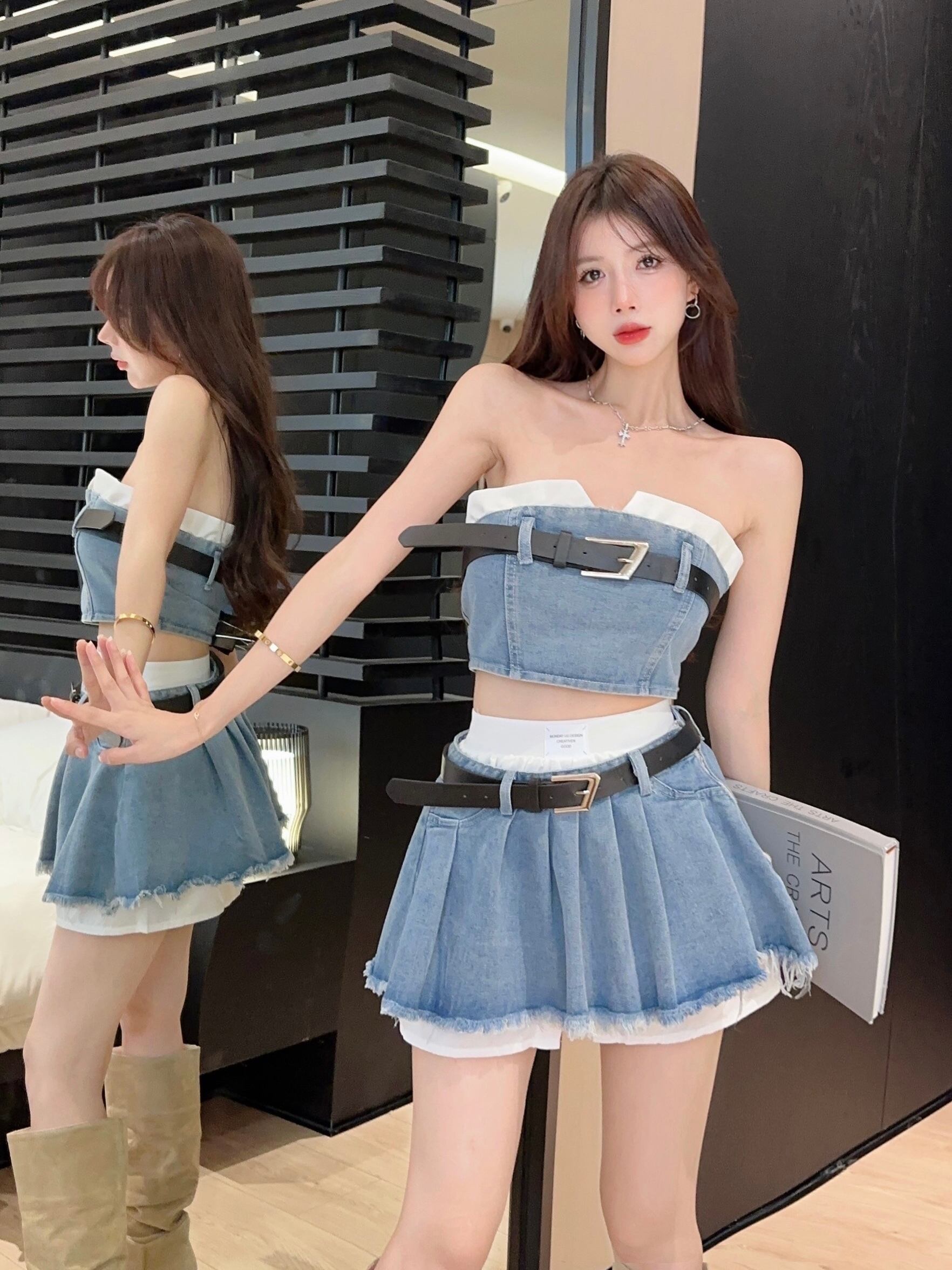 フライドストリートスタイルスーツスカート女性の純粋な欲望チューブトップトップハイウエスト薄いフェイクツーピースデニムショートスカート夏 ハイウェスト サマー 夏物 ピュア nana93691058974 | modepoisson