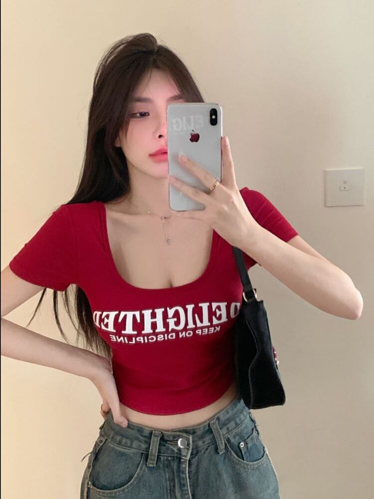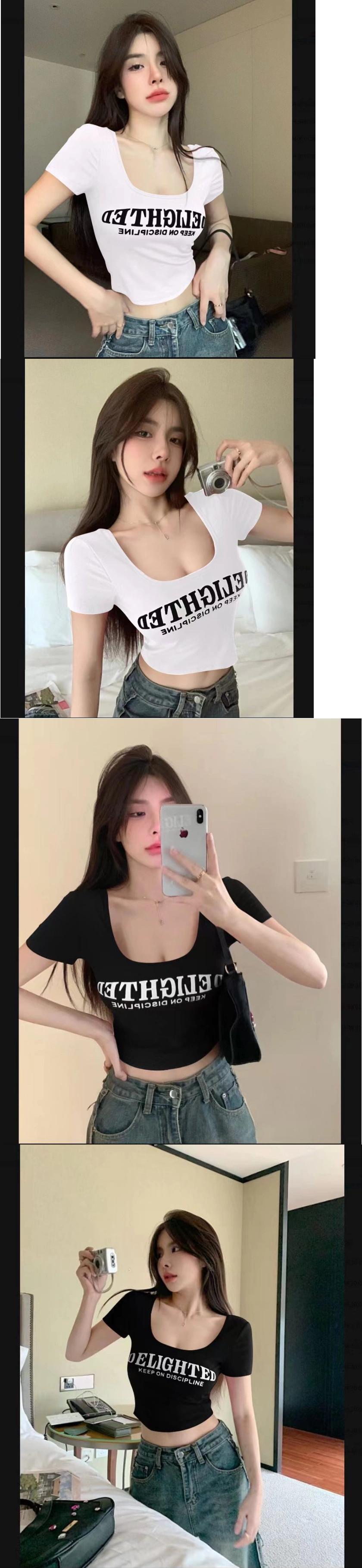 スパイス アメリカンスタイル フロントショルダー 半袖 Tシャツ レディース 夏デザイン レタープリント スリムフィット スリムニッチ ショートトップ サマー 夏物 nana83908801936 | modepoisson