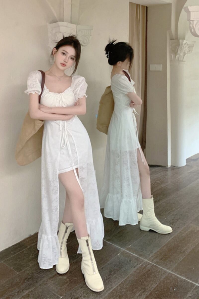 気質穏やかな風白いドレス女性の夏のシックで美しいレトロなスカートデザインセンスフレンチスクエアカラーロングスカート ホワイト サマー 夏物 スクウェア nana65552071797 | modepoisson