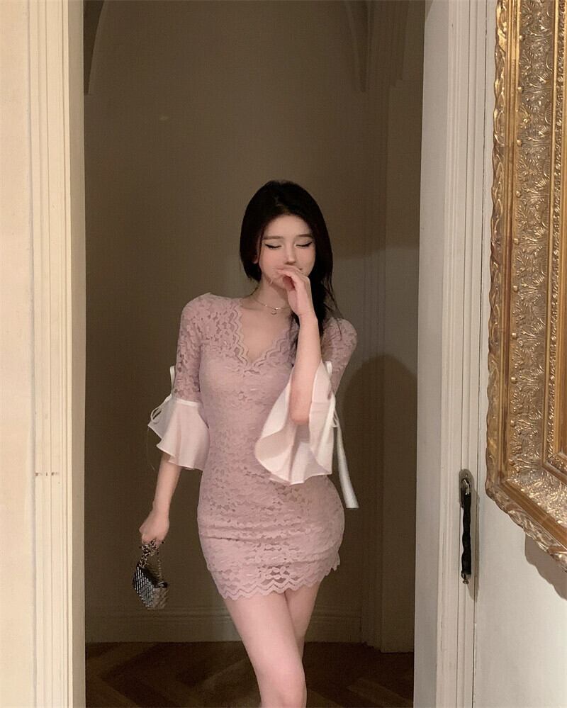 セクシーなレースの eign スタイル年齢軽減ドレス女性の夏の v ネック純粋な欲望バッグヒップスカートスリムで薄いショートスカート サマー 夏物 Vネック ピュア nana6564035505 | modepoisson