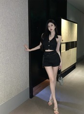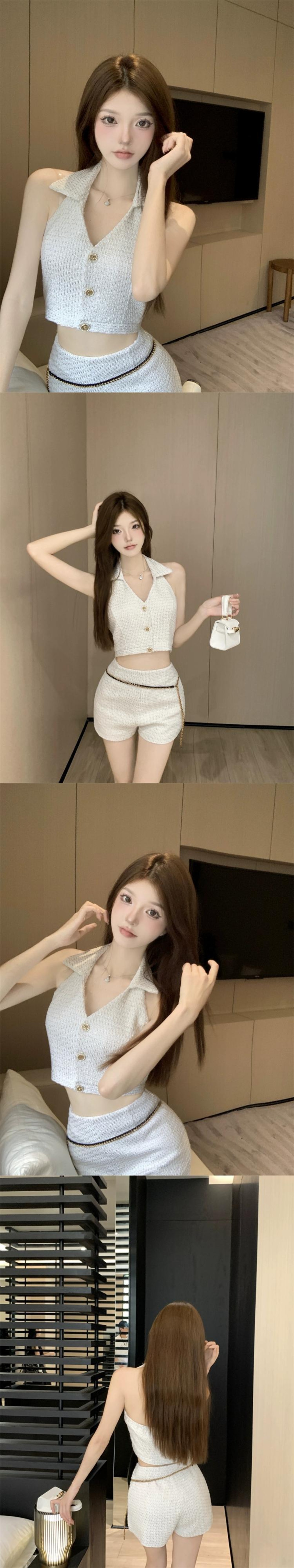 老化防止スタイルファッションスーツ小さな香りスタイルぶら下げネックショートトップハイウエストショーツ気質ツーピース婦人服夏 ハイウェスト サマー 夏物 ブルマー nana29382259853 | modepoisson