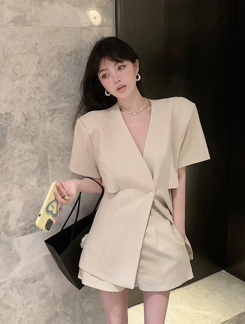 -エンドデザインセンスニッチ半袖ジャケットスリムハイウエストワイドレッグショーツ夏のファッション気質ツーピーススーツ女性 ハイウェスト サマー 夏物 ブルマー nana35553441268 | modepoisson