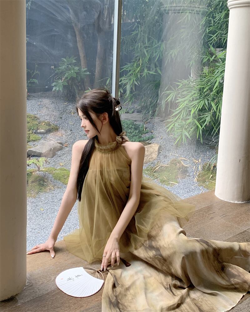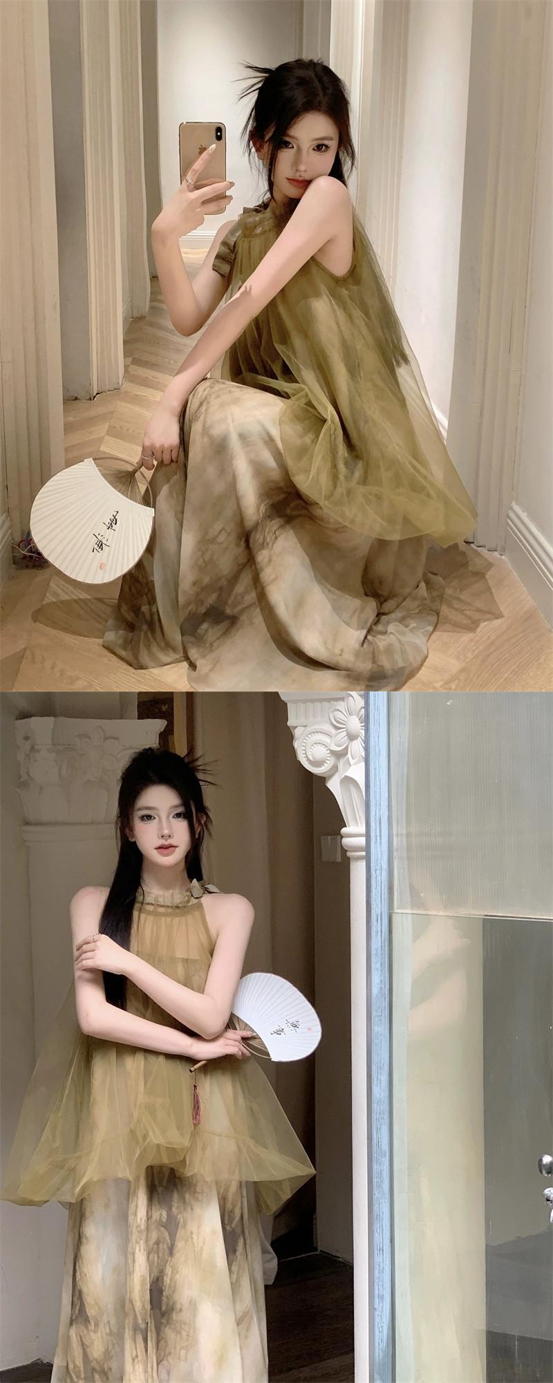 フランスの新しいドレスのハイエンドの女性の夏のデザインセンスフェイクツーピースエレガントな吊りネックメッシュシフォンロングスカート サマー 夏物 nana37587697290 | modepoisson