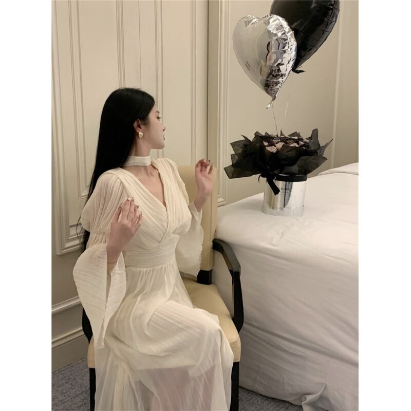 フレンチスタイルのニッチスイートドレスの女性の夏のハイエンド感覚ウエスト痩身長袖気質ロングスカート白い妖精のスカート ホワイト 大人ガーリー スウィート キュート カジュアル サマー 夏物 nana53371743064 | modepoisson