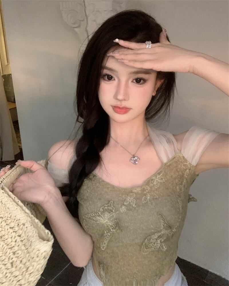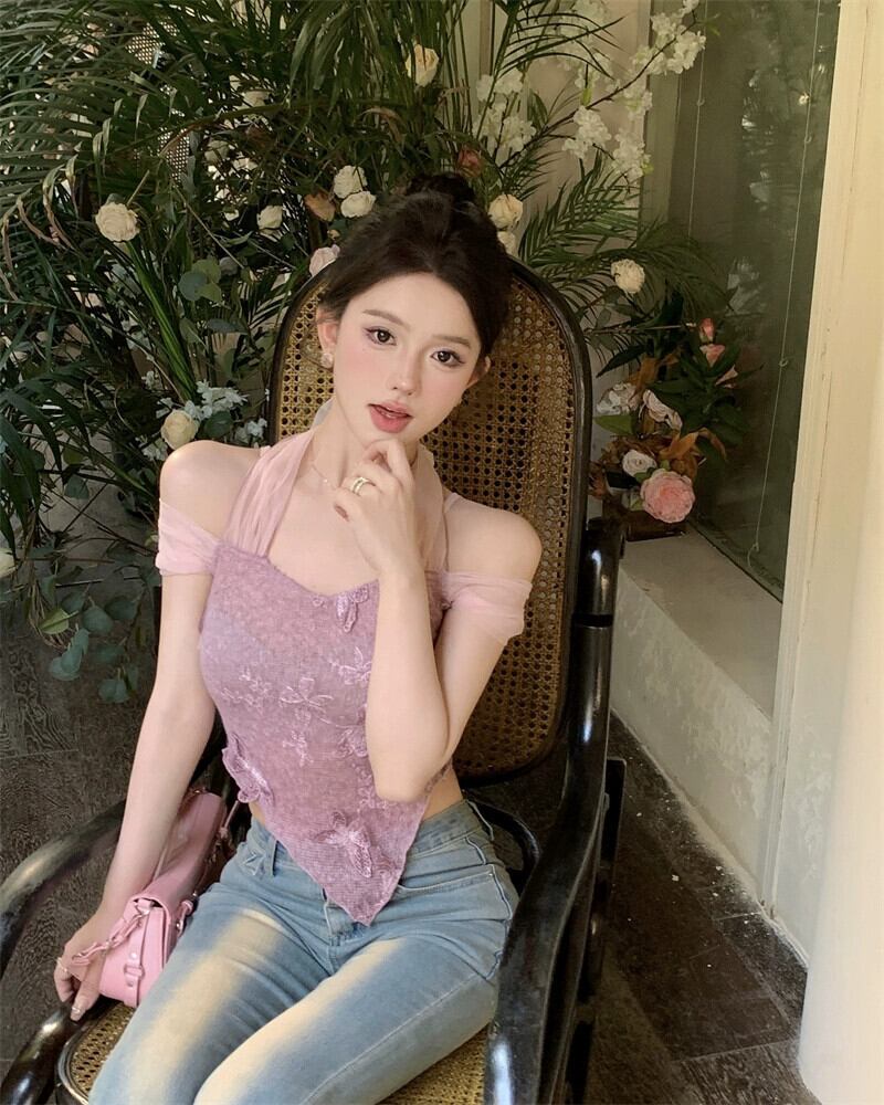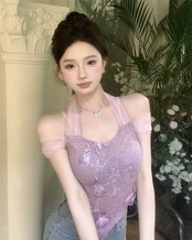 甘い吊りネックストラップシフォントップ女性の夏スリムショートワンショルダーフランスの美しい新しい 2023 小さなシャツ 大人ガーリー スウィート キュート カジュアル サマー 夏物 nana39982921833 | modepoisson