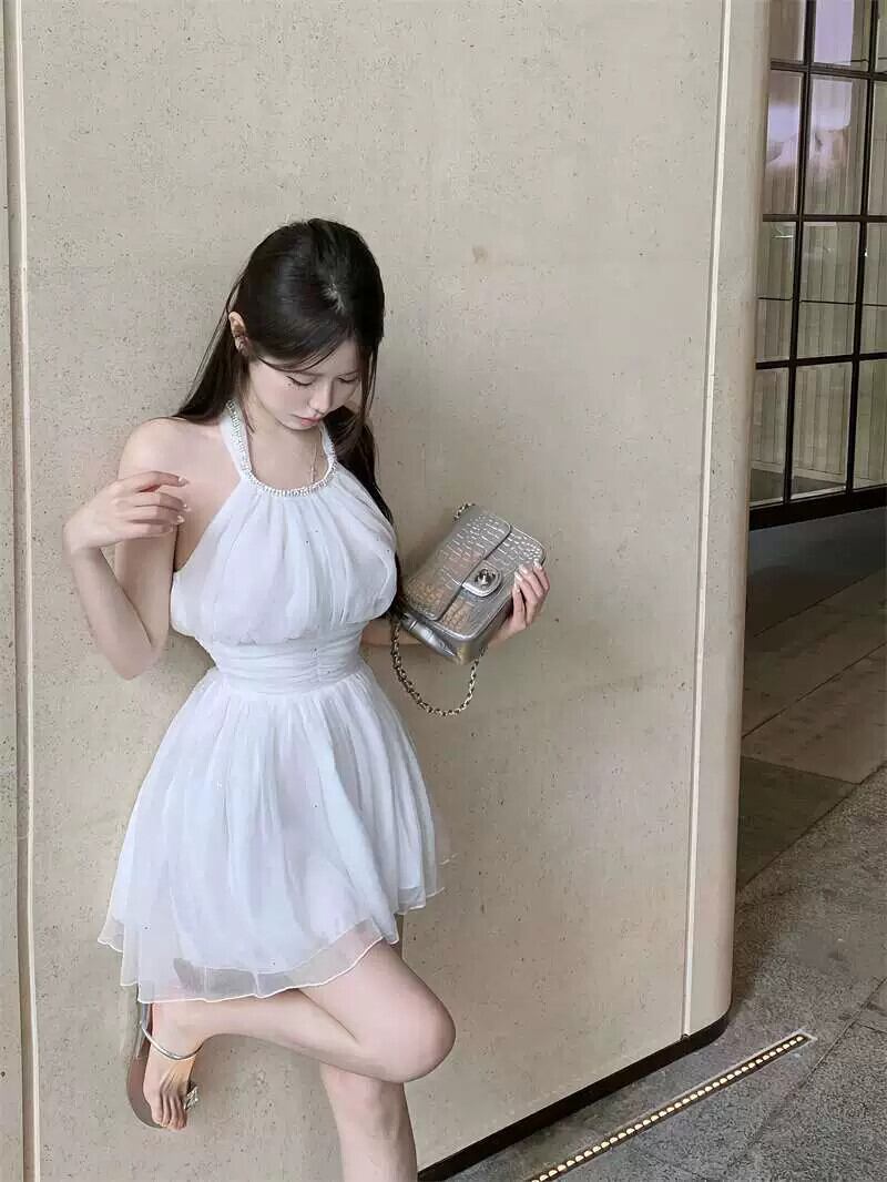 小気質甘辛ドレスウエストスリムサスペンダースカートレディース夏ノースリーブ吊りネック白ショートスカート ホワイト 大人ガーリー スウィート キュート カジュアル サマー 夏物 nana91001303328 | modepoisson