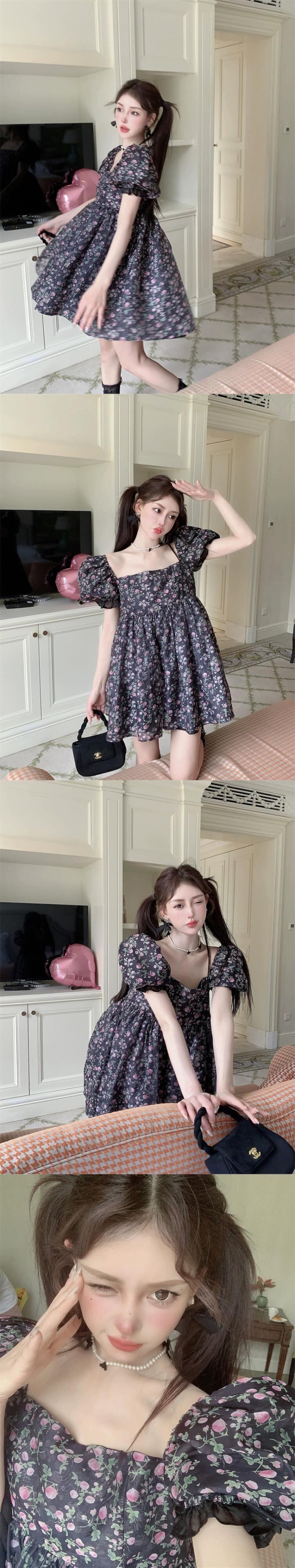 フレンチスクエアネックパフスリーブドレス女性の夏の気質ウエストスリムドレス甘い花柄ショートスカート 大人ガーリー スウィート キュート カジュアル サマー 夏物 スクウェア nana17377275647 | modepoisson
