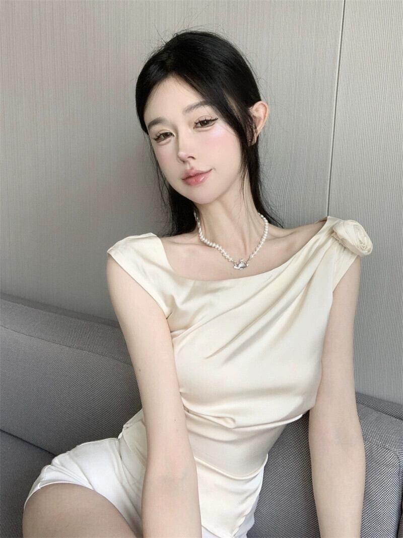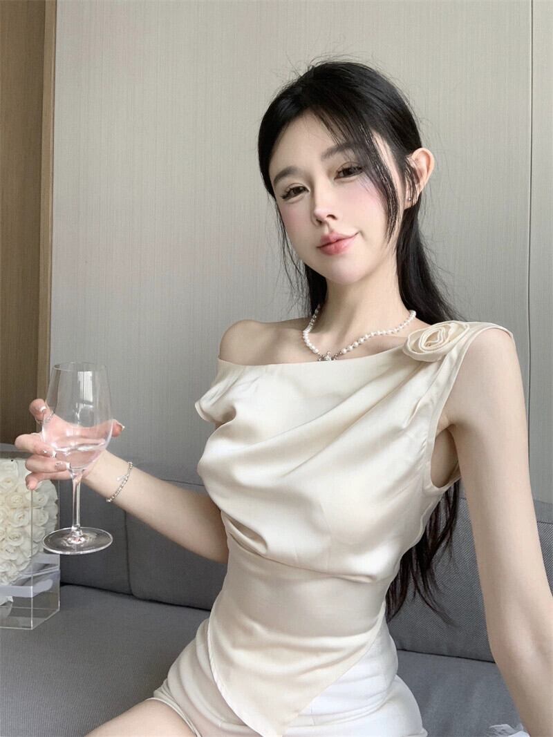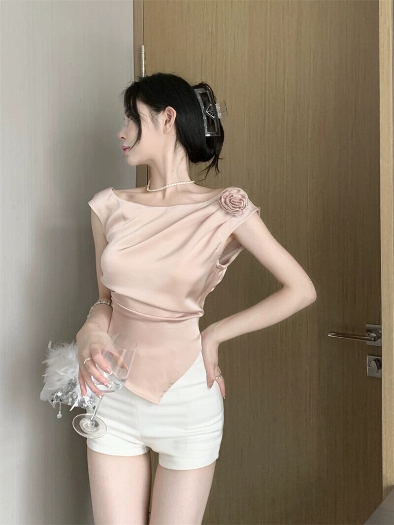 -エンドシャツレディース甘くてユニークなシックなニッチトップデザインオフショルダー自己修養ドレープスモールシャツ夏 大人ガーリー スウィート キュート カジュアル サマー 夏物 nana93310317911 | modepoisson