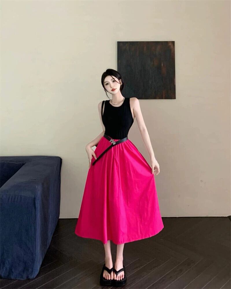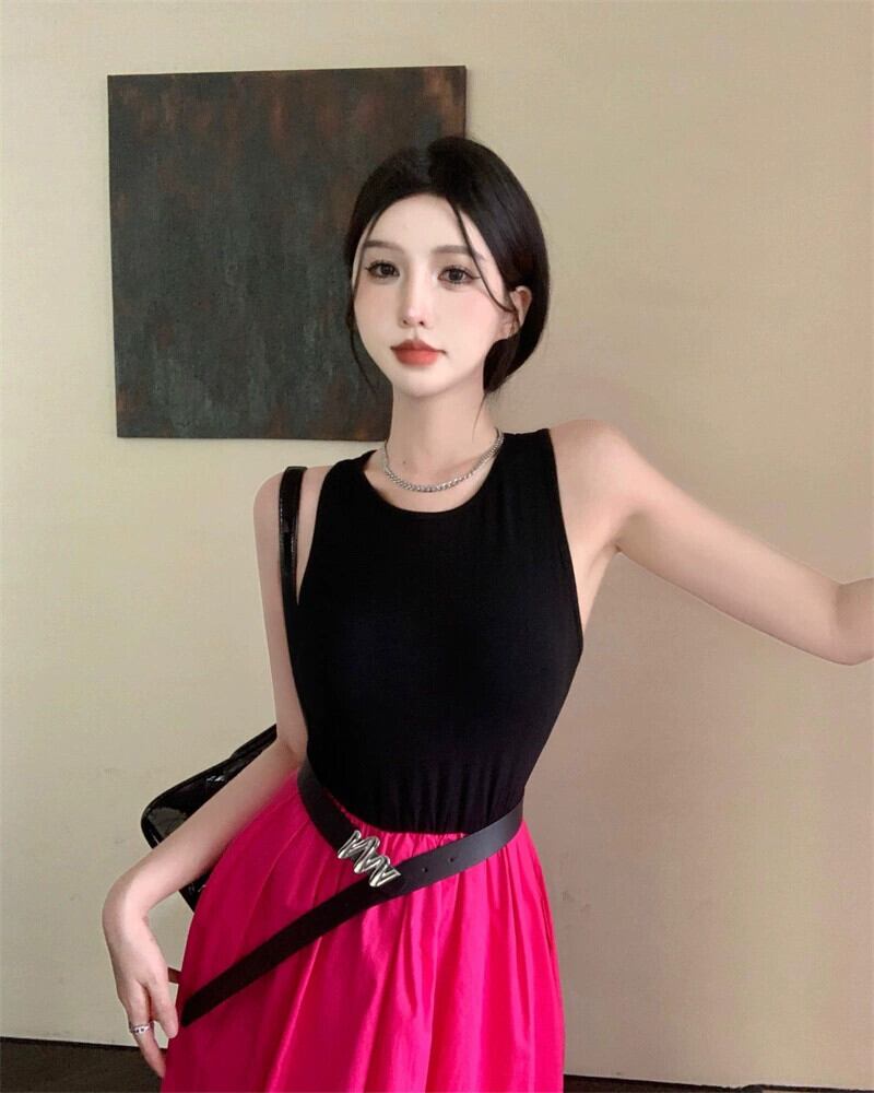 フレンチスリムノースリーブドレスの女性の夏 2023 スイートスパイスガールスカート気質スリムステッチミッドレングススカート 大人ガーリー スウィート キュート カジュアル サマー 夏物 nana58423320502 | modepoisson