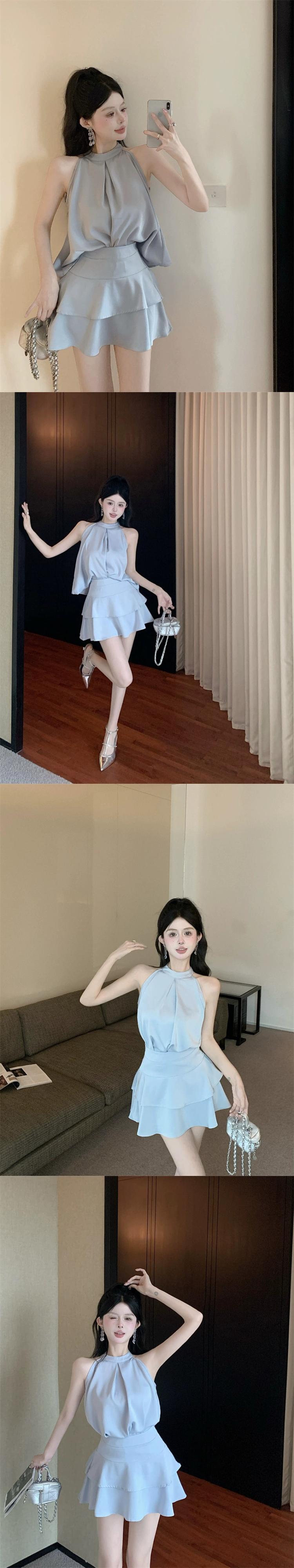 ホルターネックシックなトップ甘辛スーツ夏のハイウエストハーフレングスショートスカートファッション気質ハイエンドツーピースセット女性 ハイウェスト 大人ガーリー スウィート キュート カジュアル サマー 夏物 nana74440581012 | modepoisson