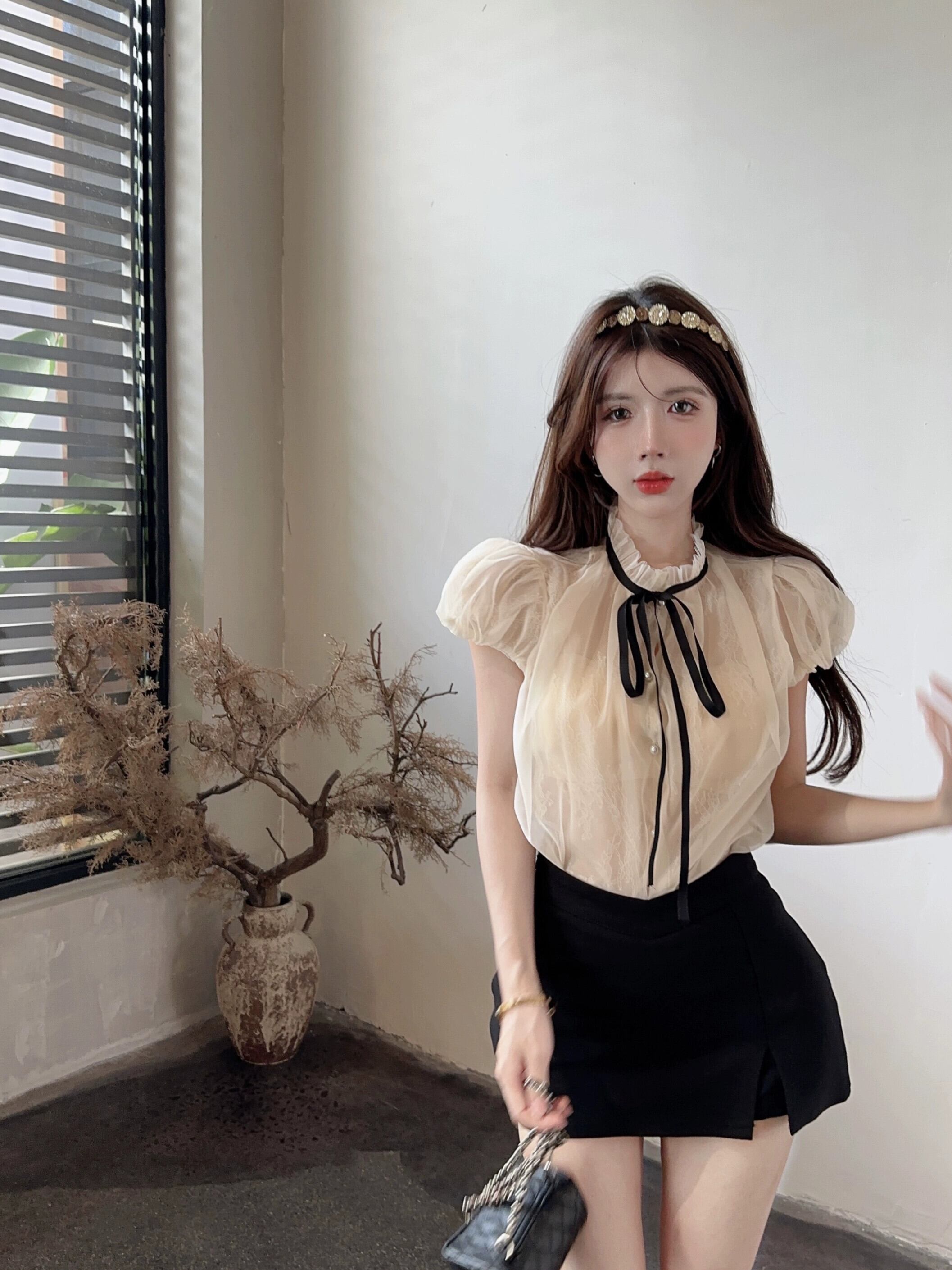 フレンチスイートリボンシフォンシャツレディース夏デザインセンスニッチ半袖シャツシックなレース気質トップ 大人ガーリー スウィート キュート カジュアル サマー 夏物 nana60599008677 | modepoisson