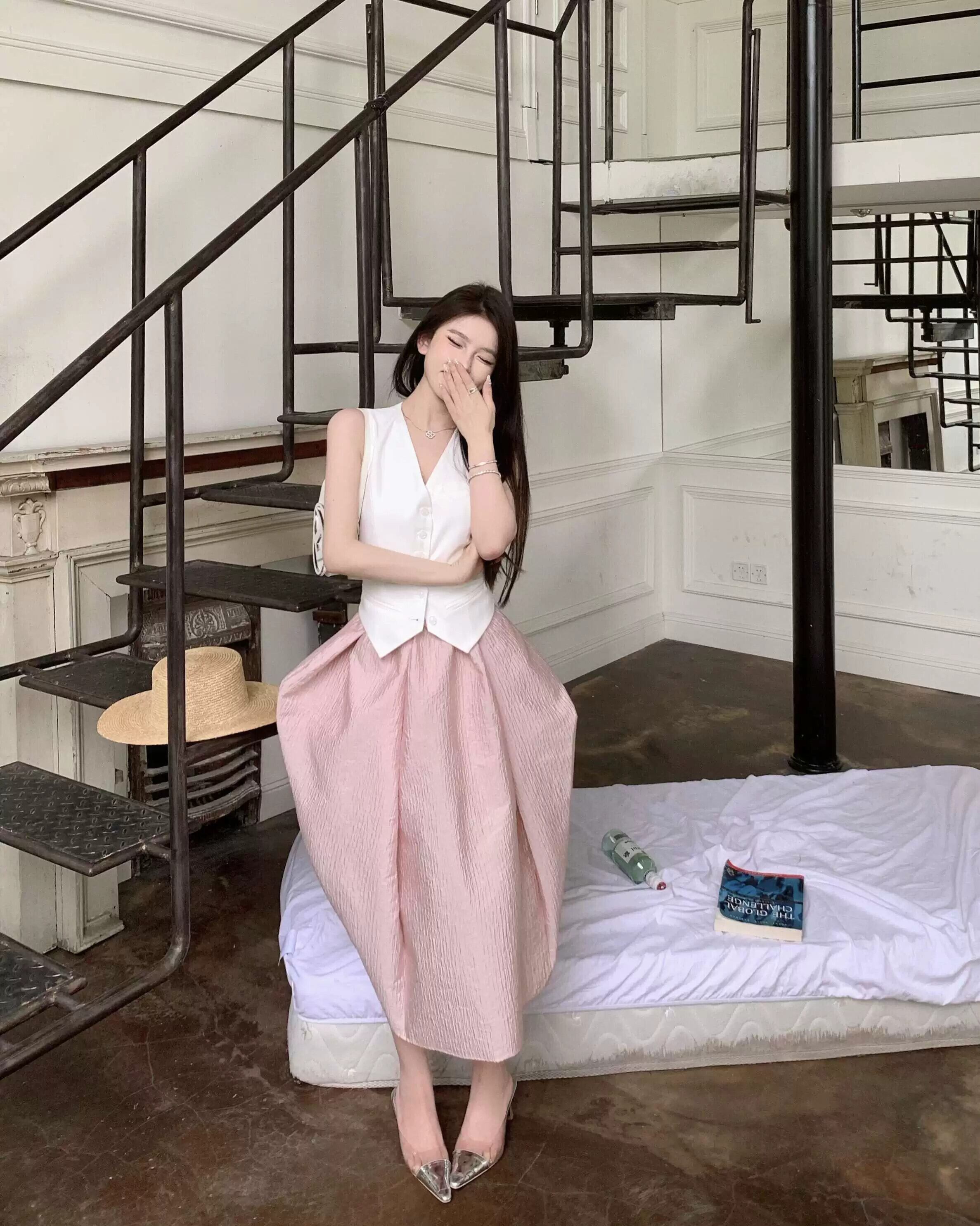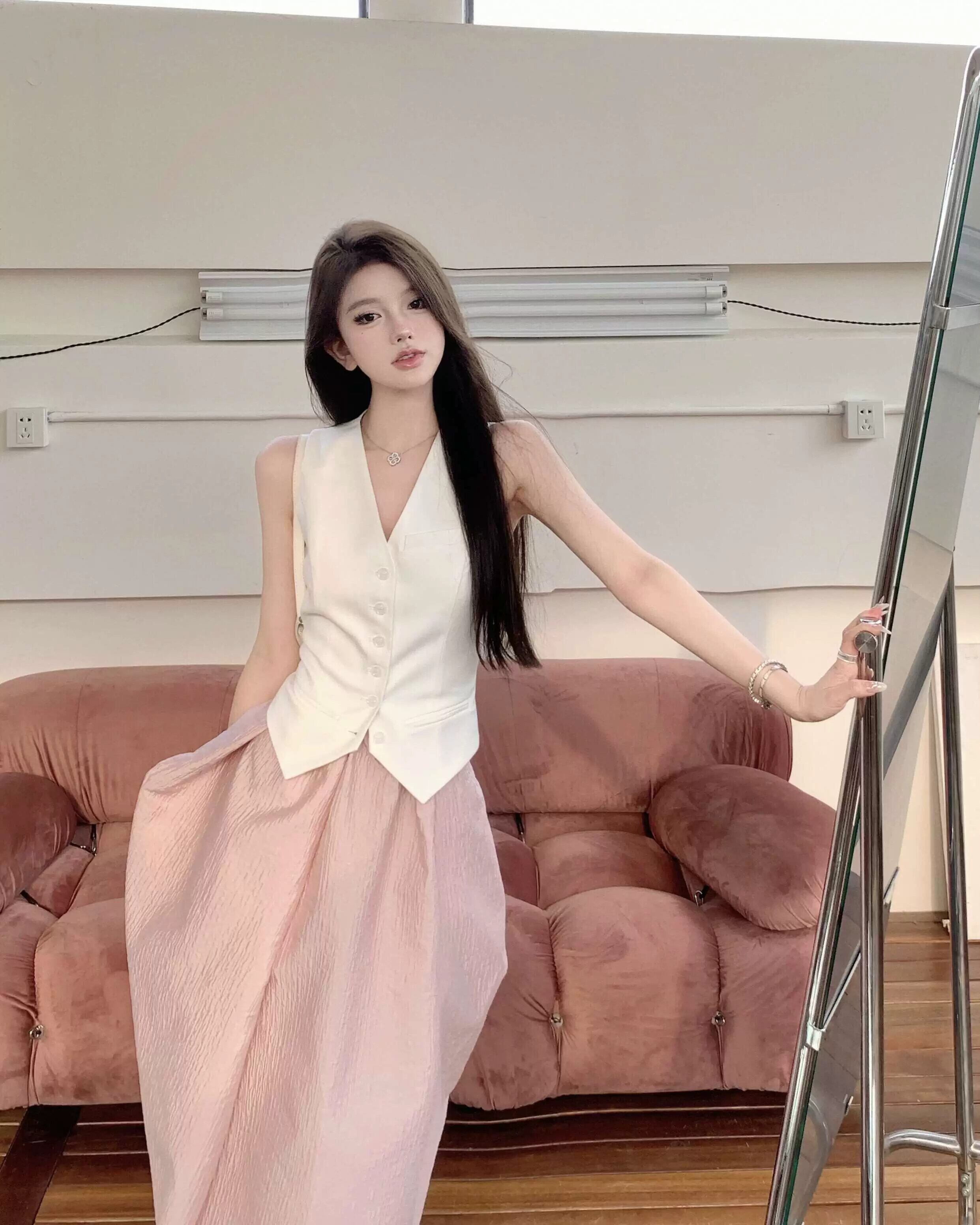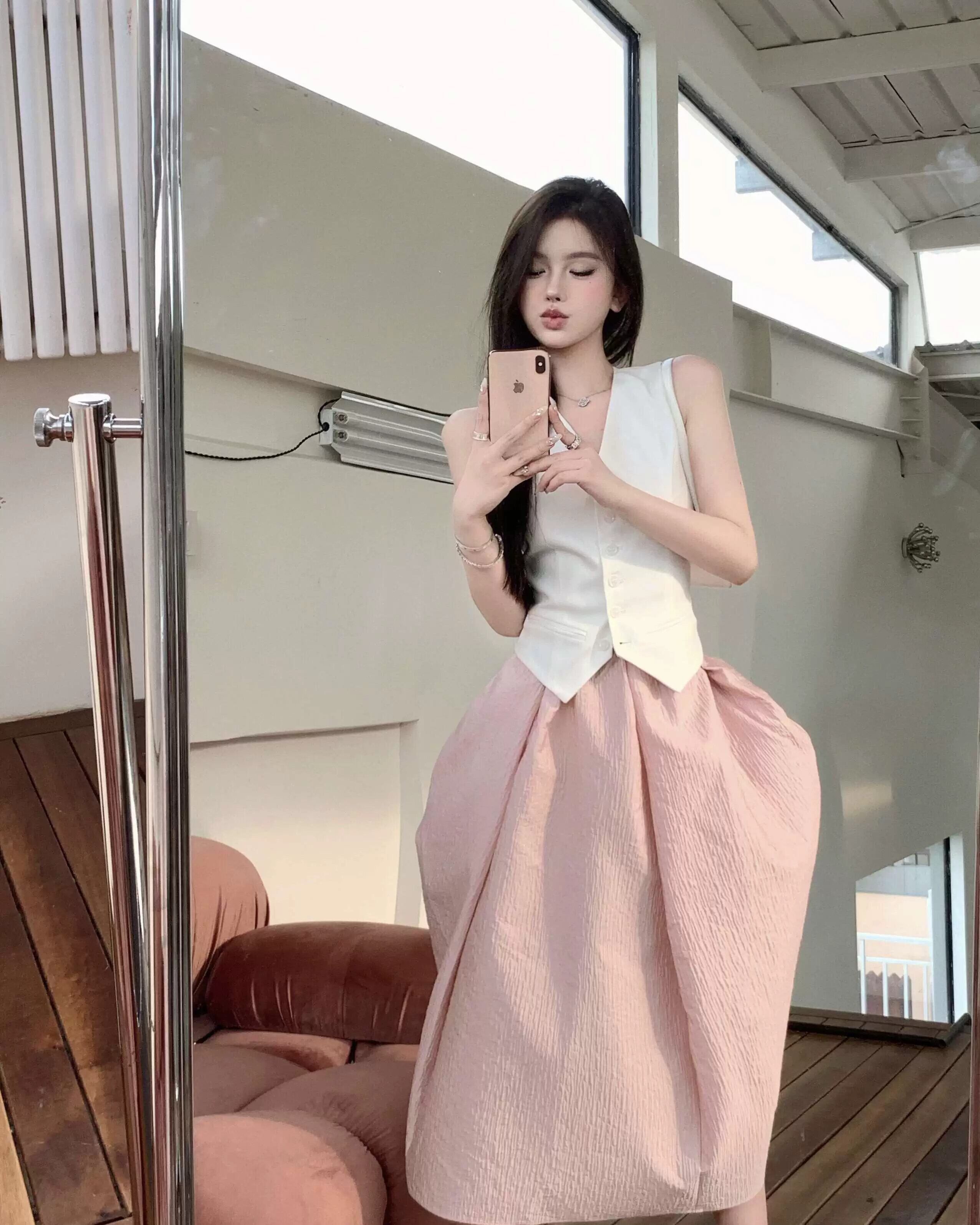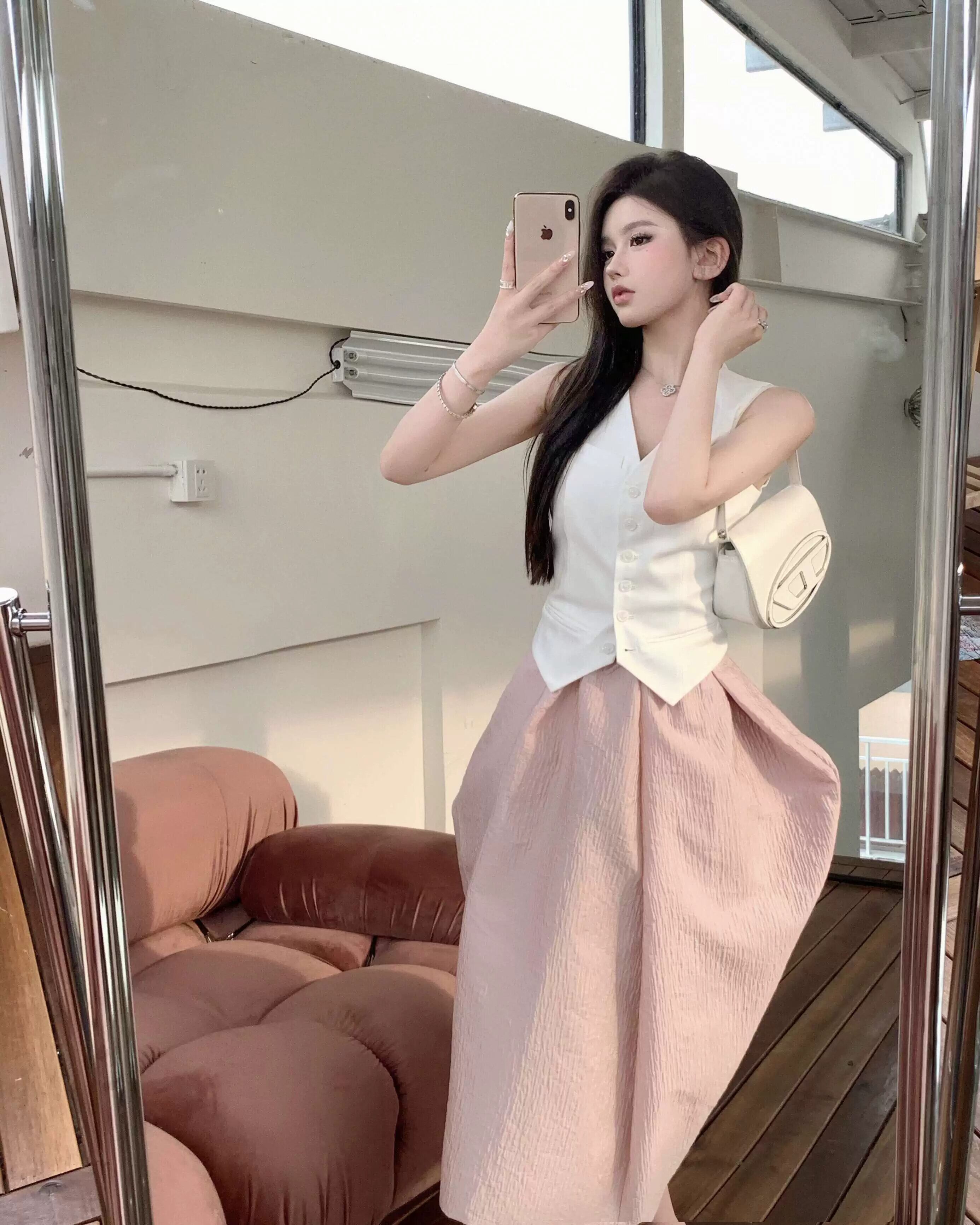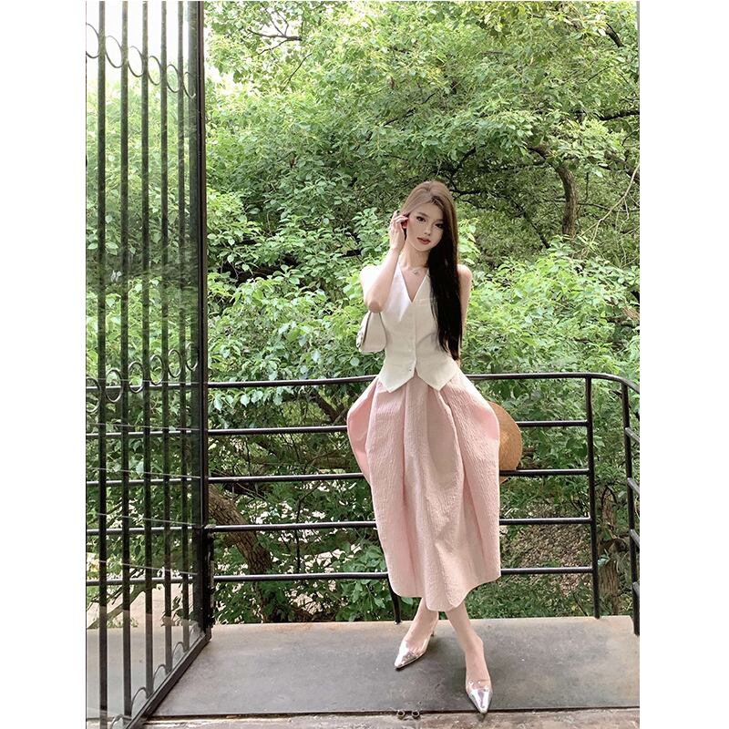 色:ピンクのスカート,白いベスト
