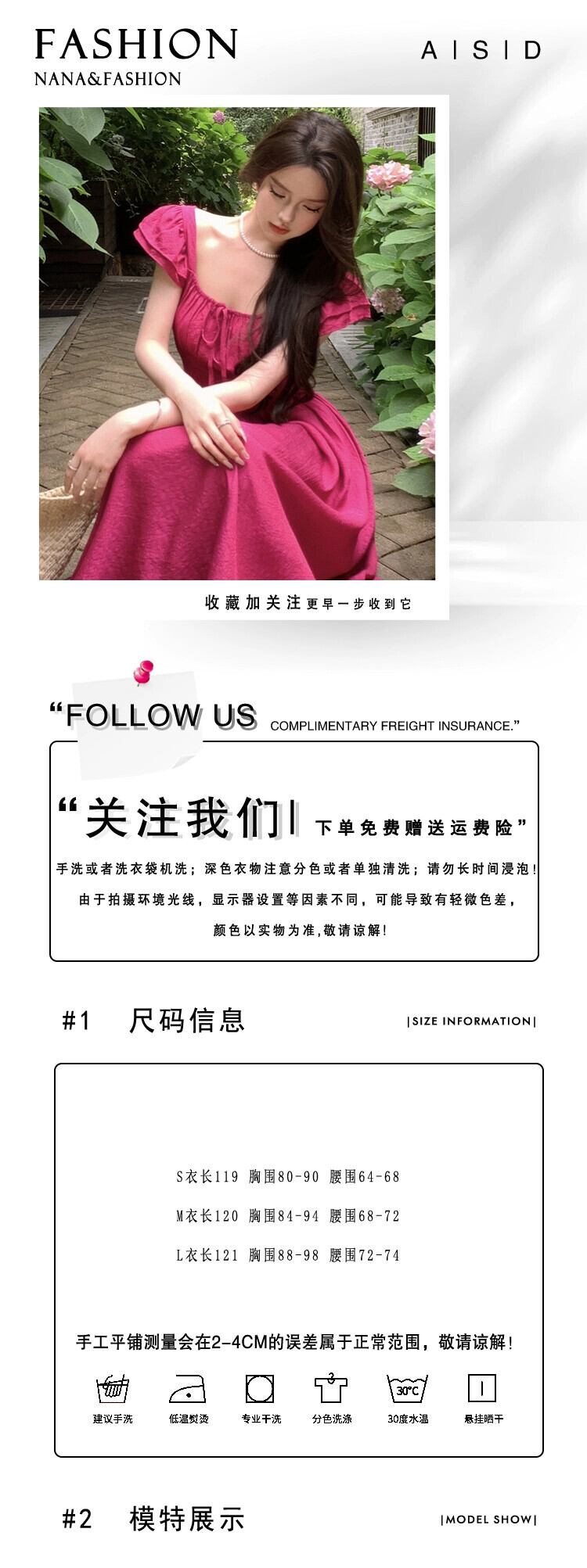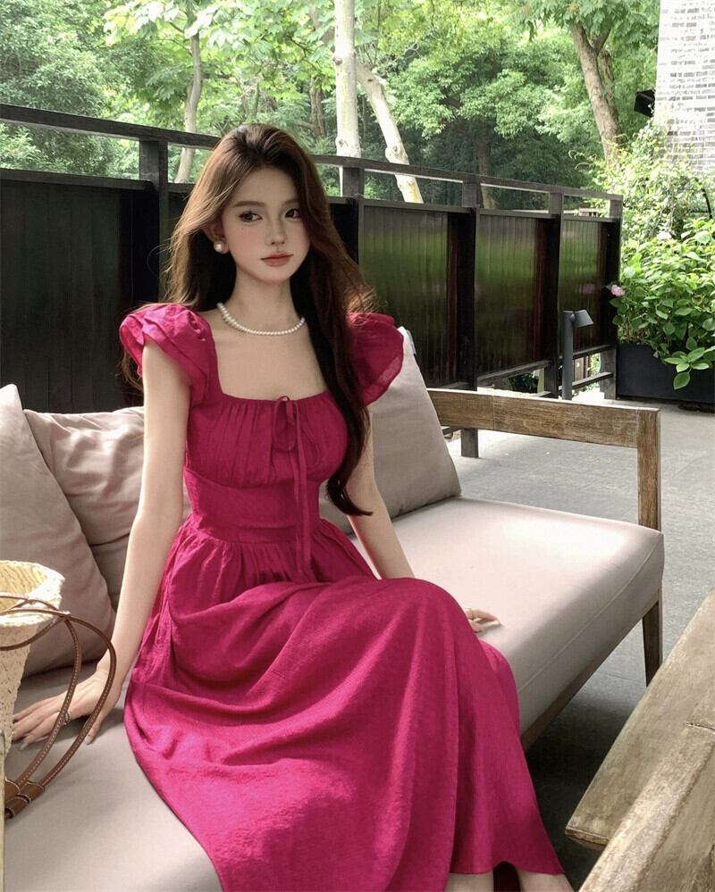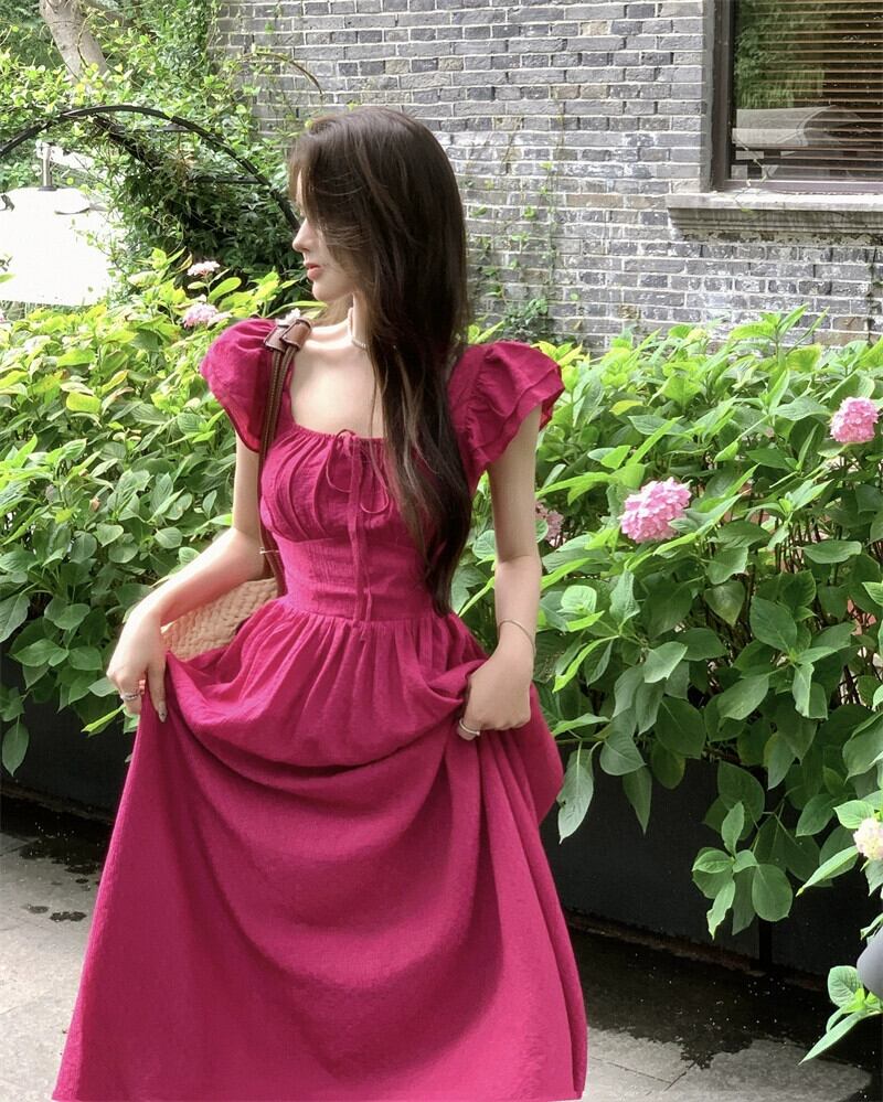 フレンチスイートスタイルスクエアカラードレス女性の夏のレトロフライングスリーブウエスト痩身ロングスカートスリムホリデースカート 大人ガーリー スウィート キュート カジュアル サマー 夏物 スクウェア nana88301975480 | modepoisson