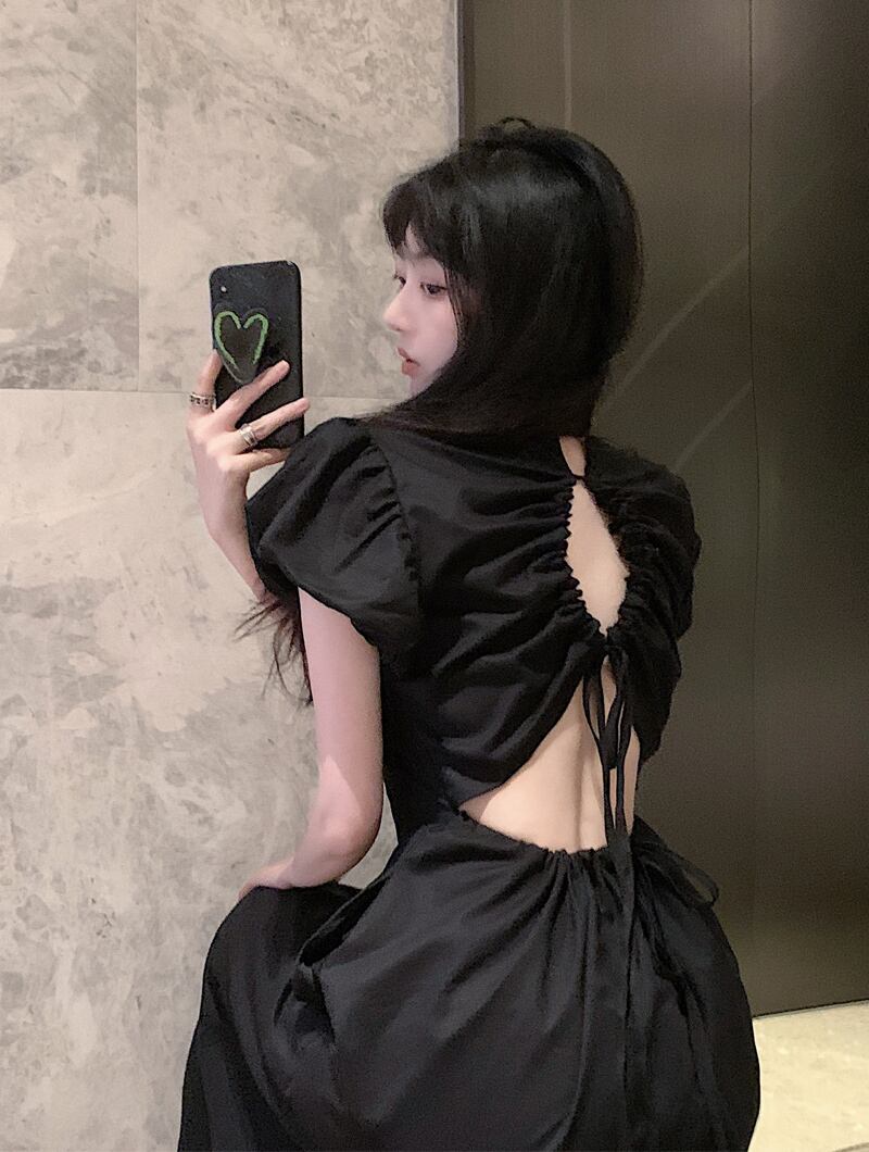 フレンチヘボン風ブラックドレスレディース夏デザイン高級感のあるロングスカート パフスリーブハイウエストスリムスカート ハイウェスト サマー 夏物 nana27238399317 | modepoisson