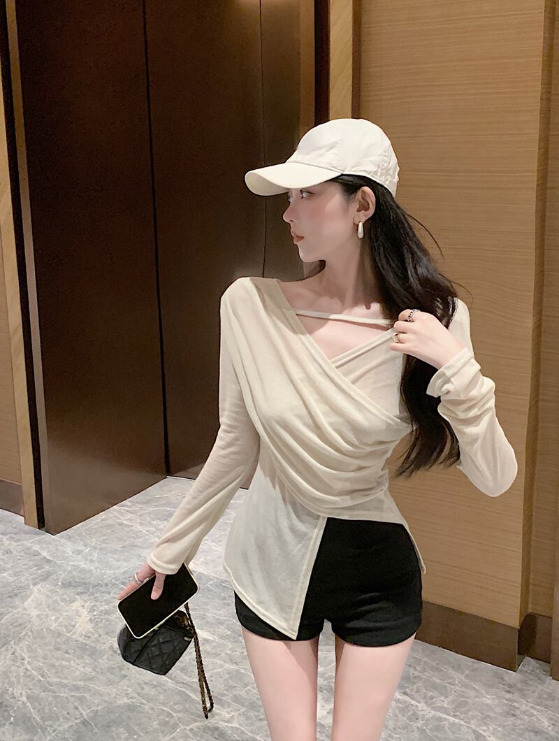 薄手で通気性のある日焼け止めシャツ長袖 Tシャツレディース夏カジュアルフレンチニッチ不規則シックスリム V ネックトップ ロング サマー 夏物 Vネック nana80161051260 | modepoisson