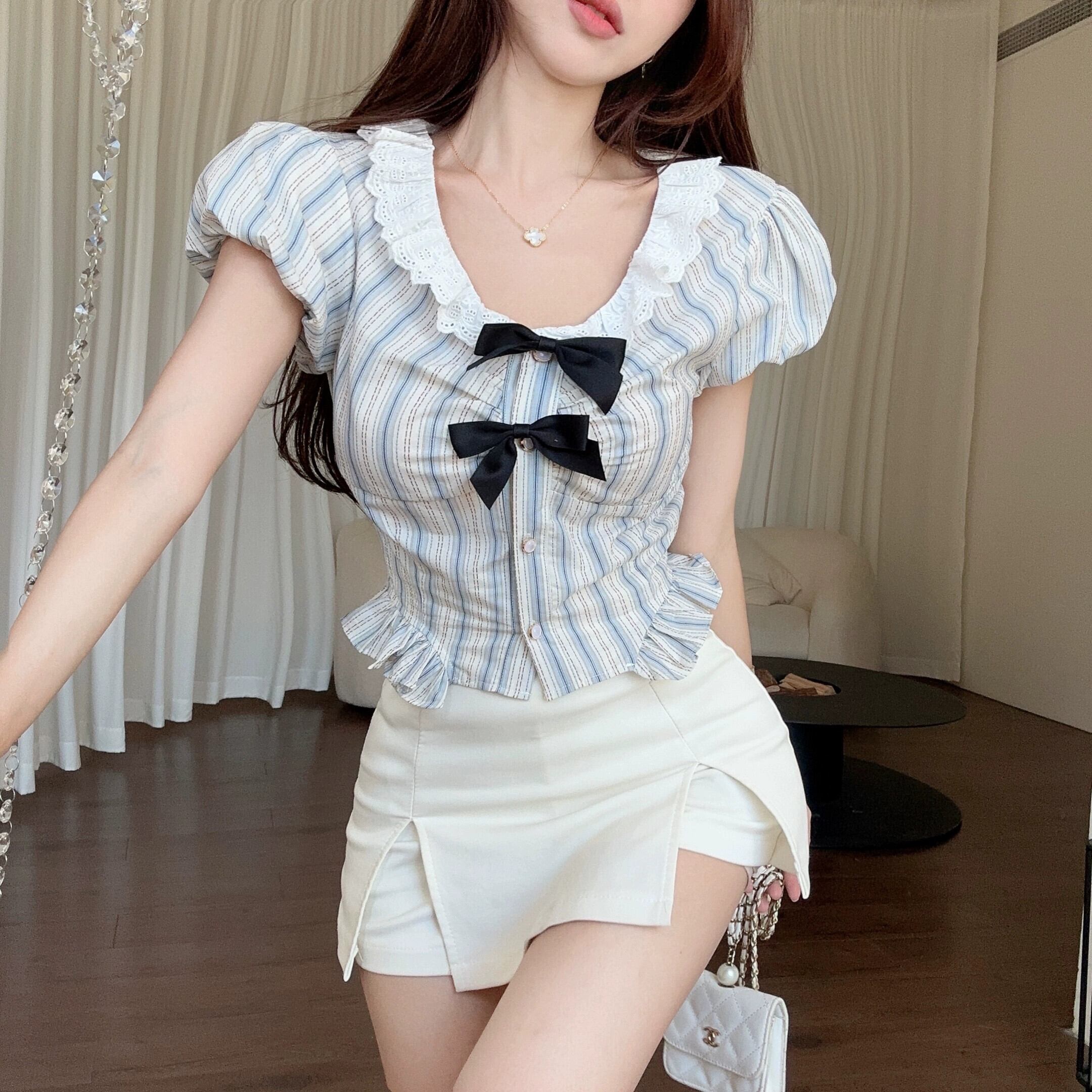 ブルーストライプレースシャツ半袖スリムパフスリーブ甘いスパイシーなウエストスリムショートトップ女性の夏 ハーフスリーブ 大人ガーリー スウィート キュート カジュアル サマー 夏物 nana61649424976 | modepoisson